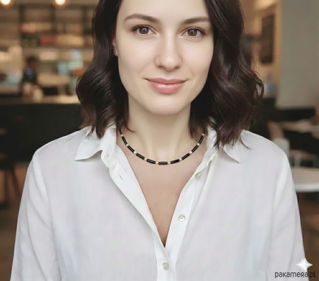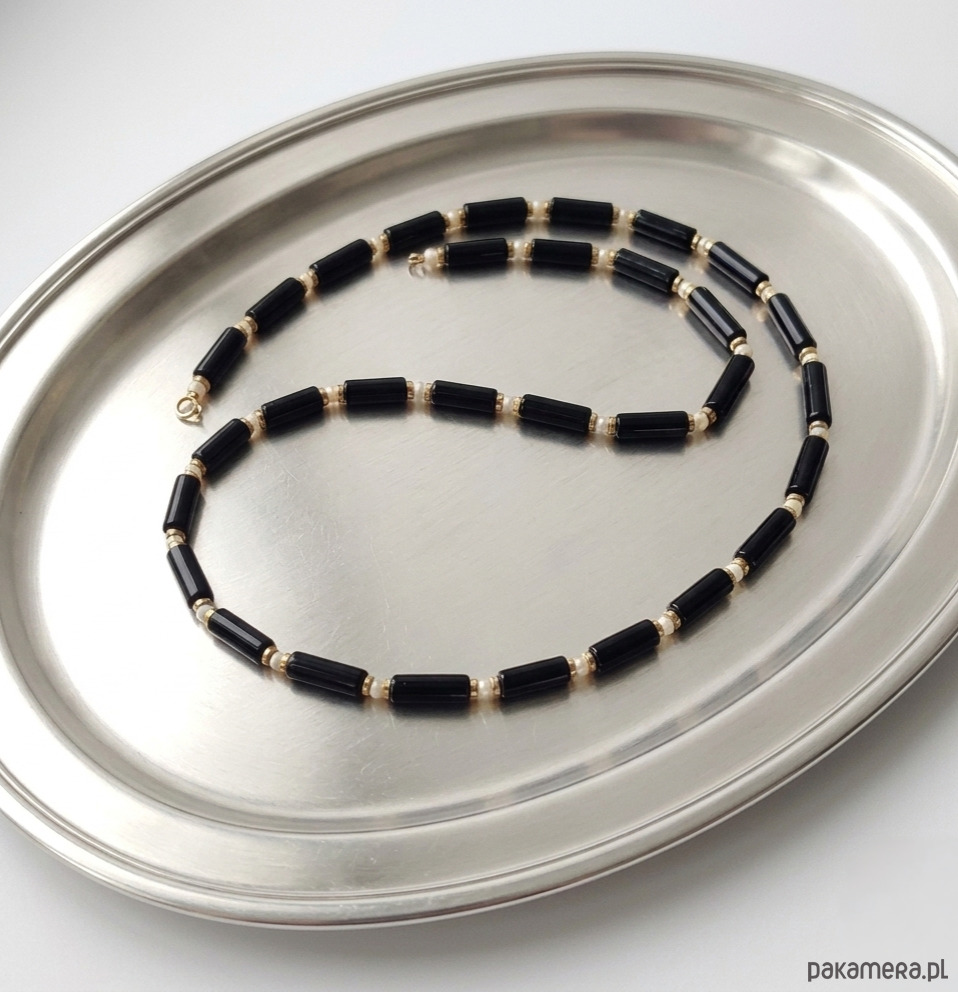 Naszyjnik idealny w swej prostocie, wykonany z sekwencji rureczek lśniącego, czarnego onyksu, złoconego hematytu i kuleczek masy perłowej. Klasyczne trio kolorystyczne oraz piękny połysk - to przepis na udaną biżuterię, pasującą na wiele okazji. Niezbędnik w każdej szkatułce. Wykończenie z pozłacanego srebra.