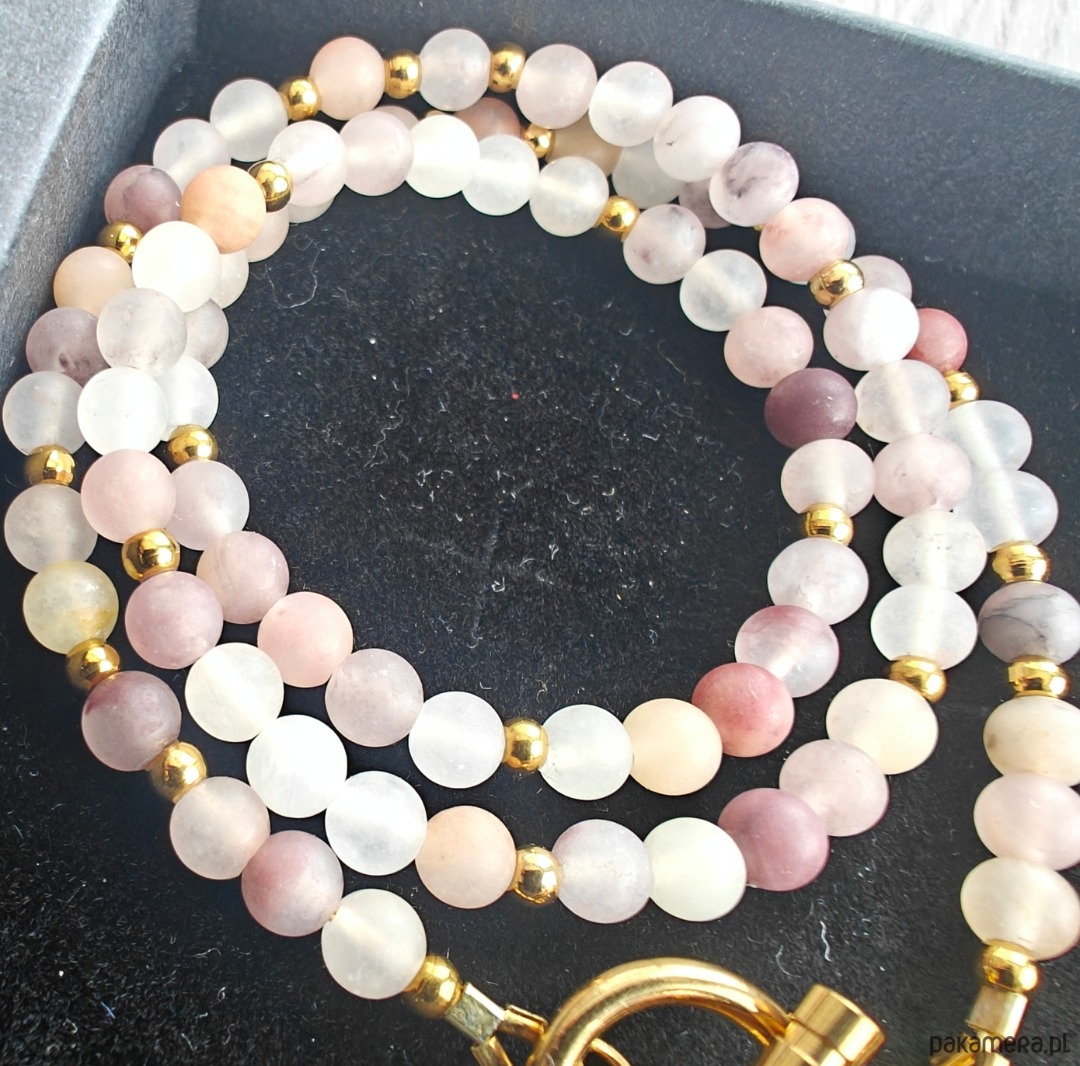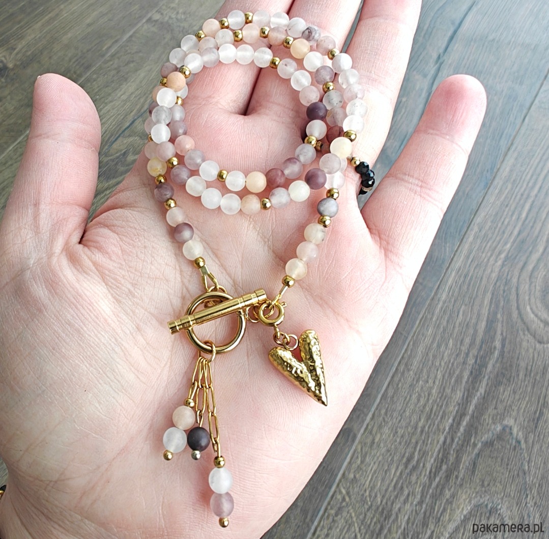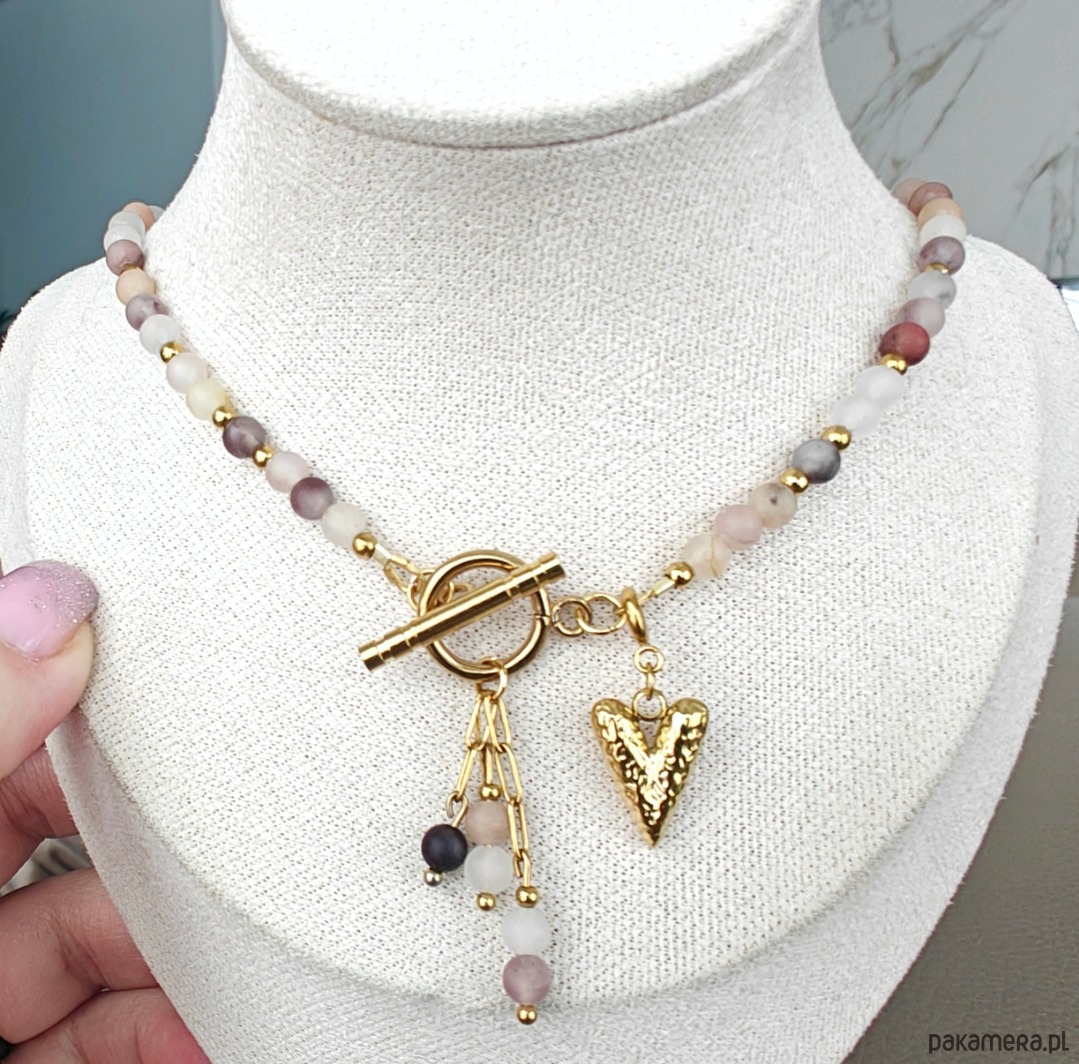 Naszyjnik wykonany z naturalnego agatu słonecznego, o długości 44 cm, z zawieszką o długości około 3 cm oraz dodatkową, odpinaną zawieszką w kształcie serca. Dzięki możliwości odpięcia zawieszki serca naszyjnik można stylizować na różne sposoby – bardziej wyrazisty lub w delikatniejszej, minimalistycznej formie. Całość uzupełniają elementy ze stali chirurgicznej oraz drobne elementy ze srebra pozłacanego, które nadają biżuterii elegancki i ciepły charakter.