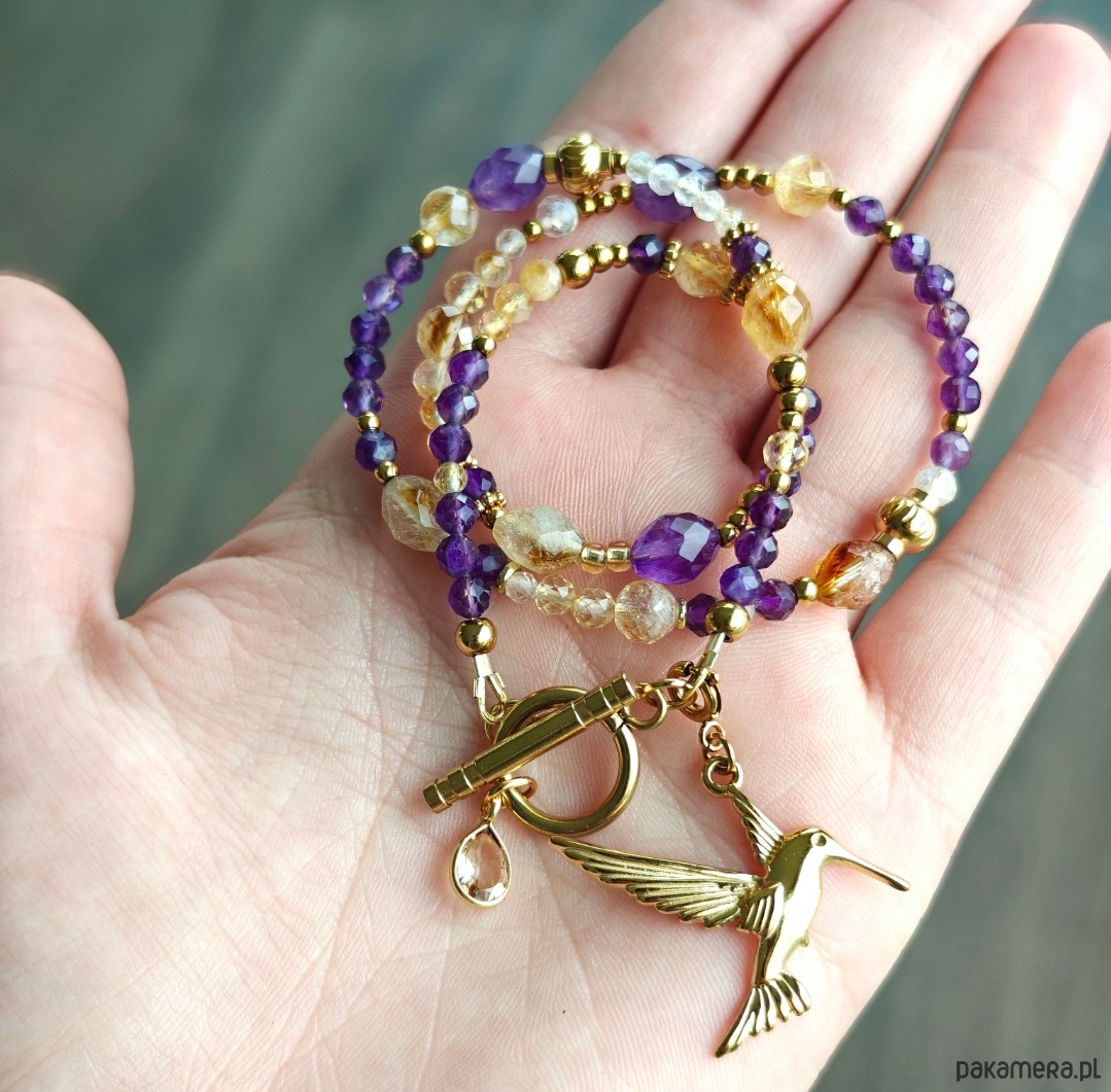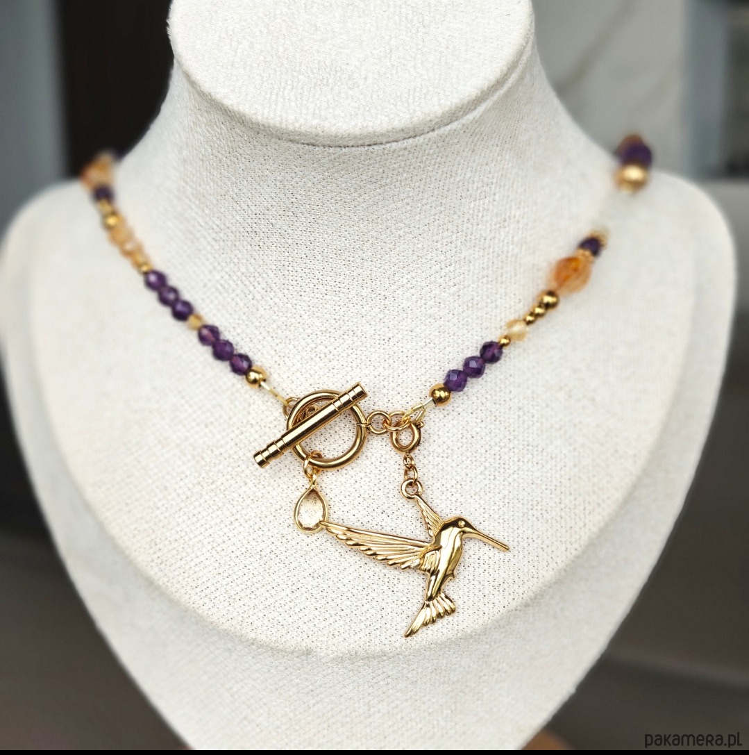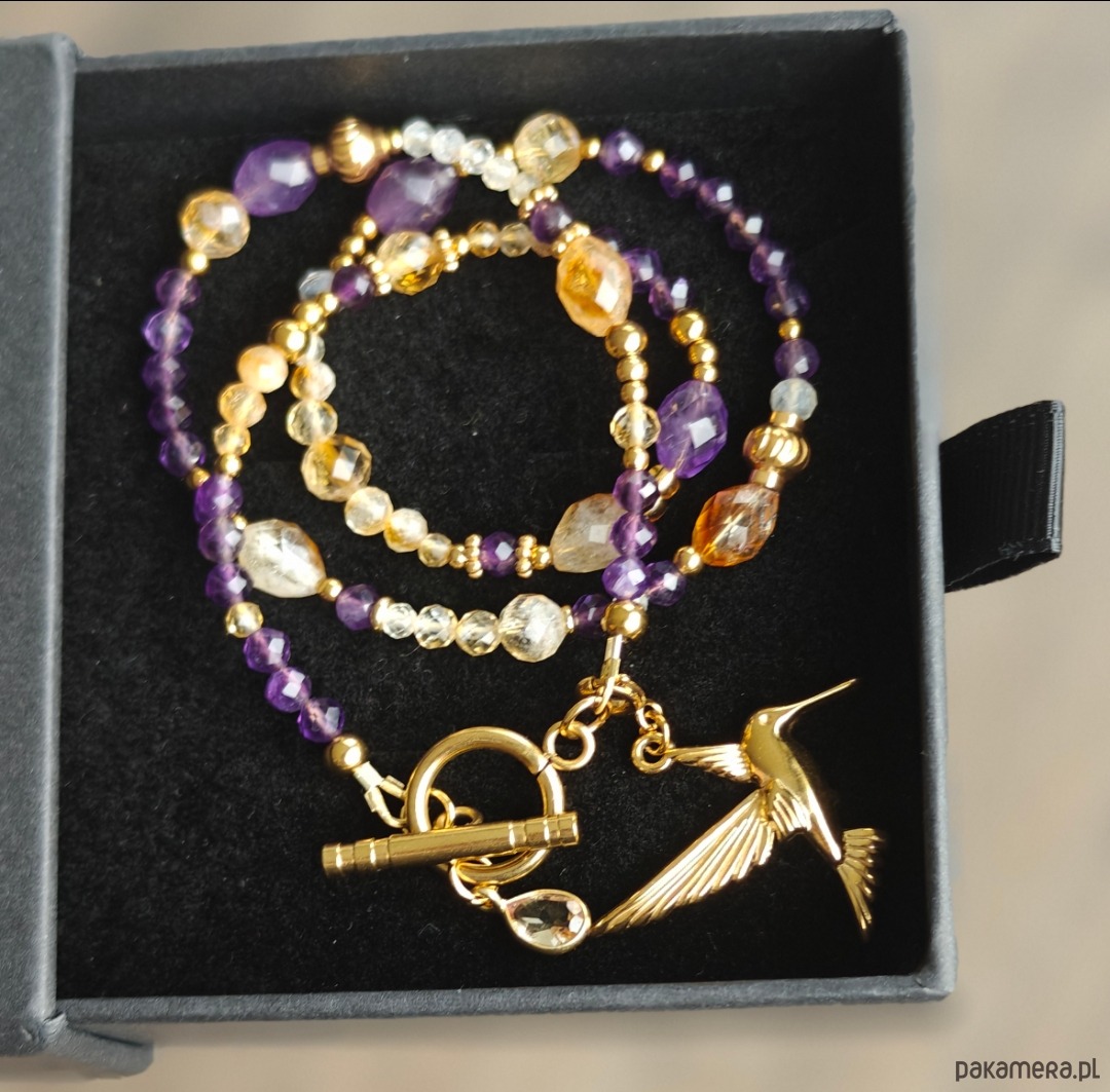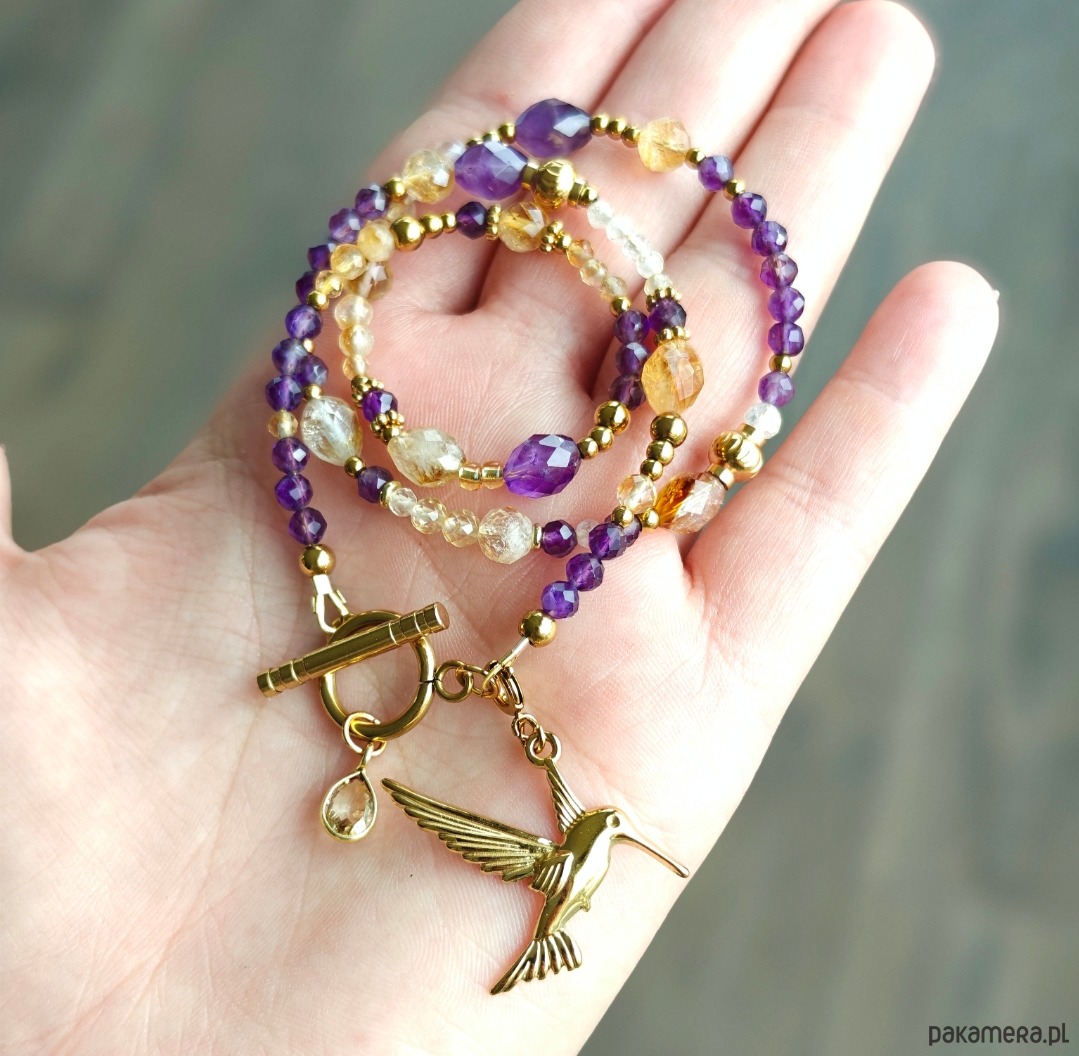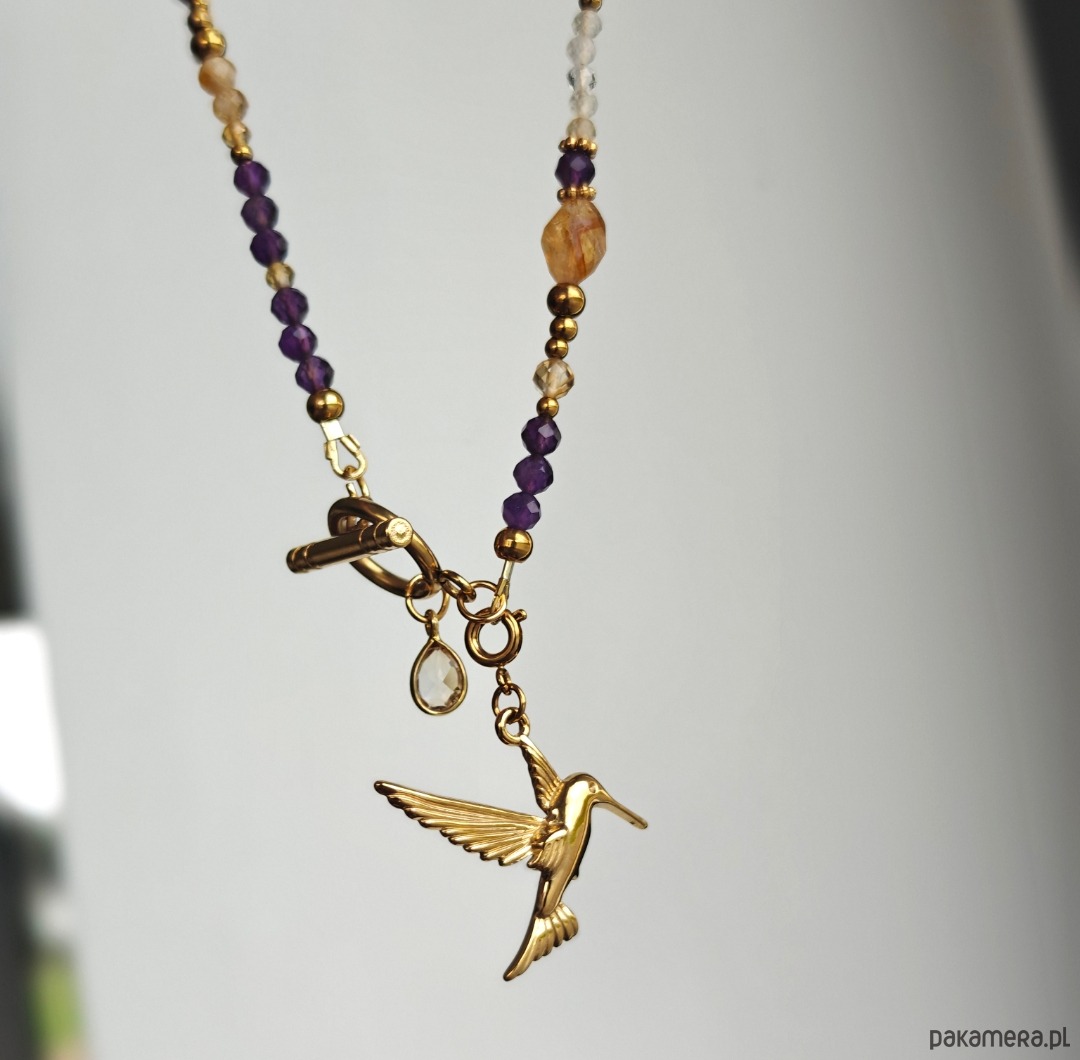 Naszyjnik wykonany z ametystu, cytrynu i kryształu o długości 40 cm (+ zapięcie i zawieszka 44 cm). Uzupełniony został o przekładki ze stali chirurgicznej oraz drobne elementy ze srebra pozłacanego. Całość dopełnia bestsellerowa zawieszka koliberka, którą można łatwo odpiąć i dzięki temu modyfikować naszyjnik, nosząc go na różne sposoby. Pakowany w eleganckie pudełko, idealny również na prezent. 🎁