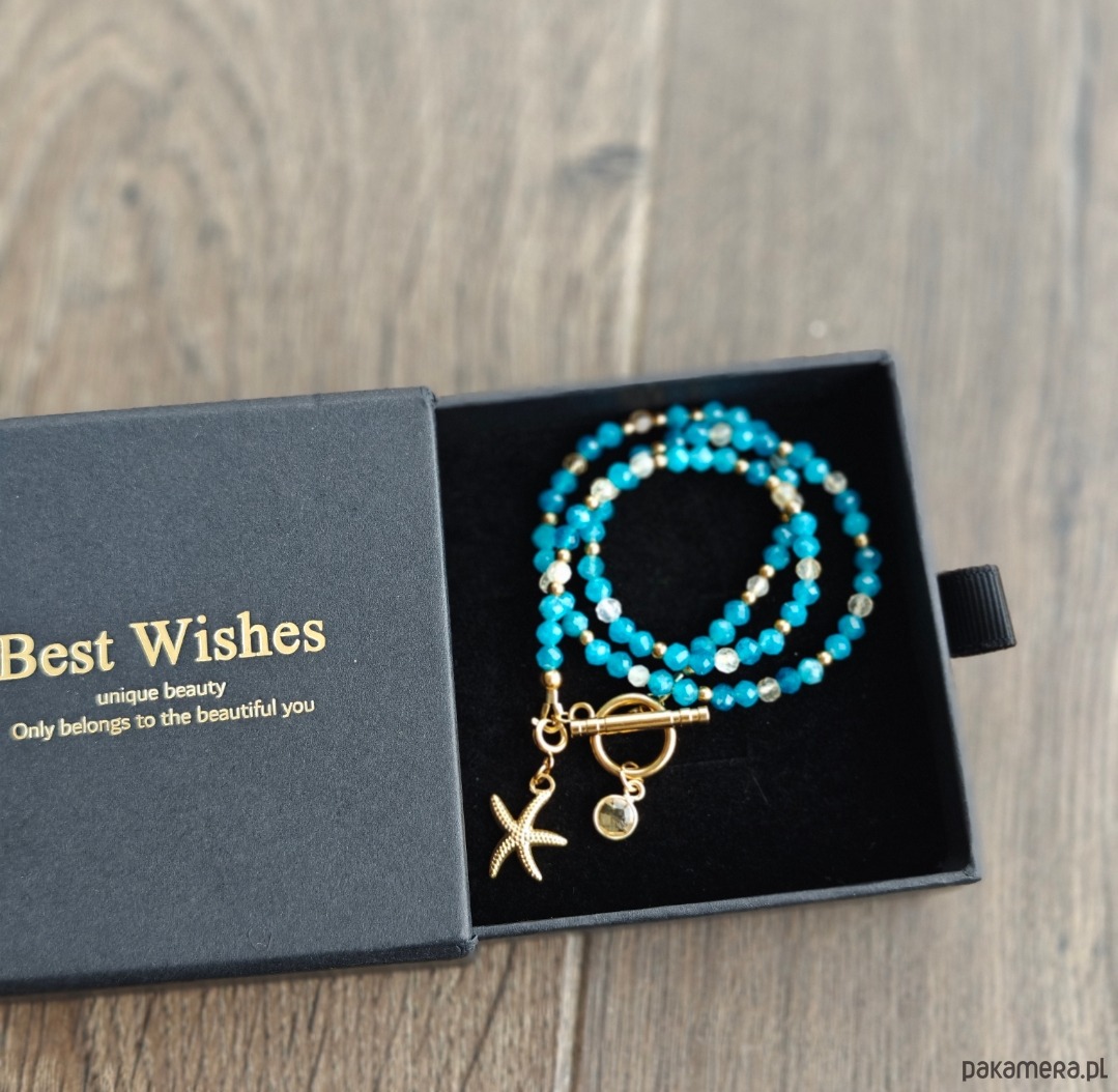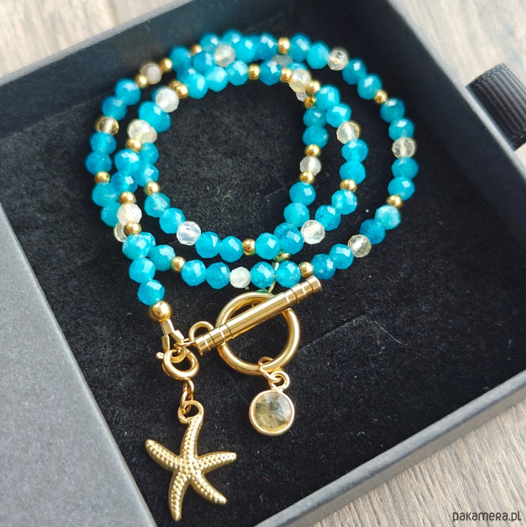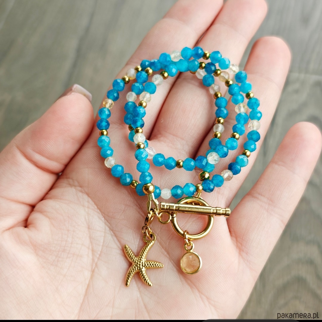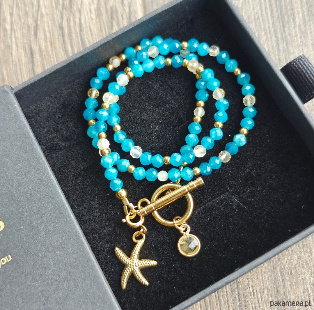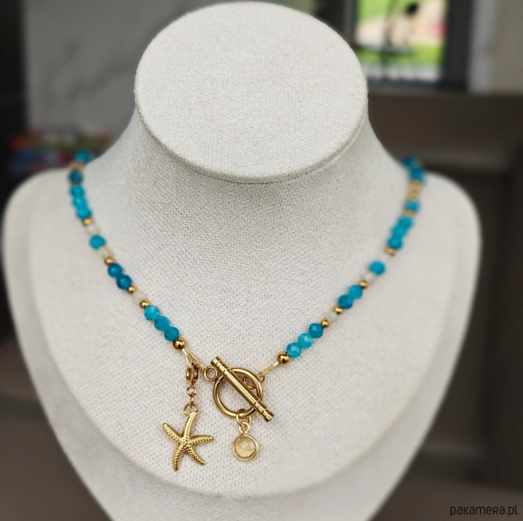 Naszyjnik wykonany z pięknego, błękitnego chalcedonu w połączeniu z cytrynem, uzupełniony elementami ze stali chirurgicznej oraz drobnymi akcentami ze srebra pozłacanego. Jego długość to 40 cm w obwodzie, a z zapięciem i zawieszką – 43 cm. Całość dopełnia odpinana zawieszka, która pozwala modyfikować naszyjnik i dopasować go do różnych okazji i stylizacji. Eleganckie pudełko dołączone do naszyjnika sprawia, że idealnie nadaje się on także na prezent. 🎁