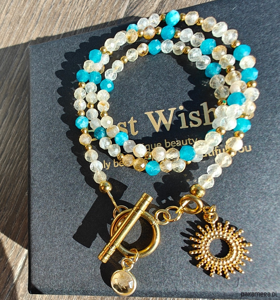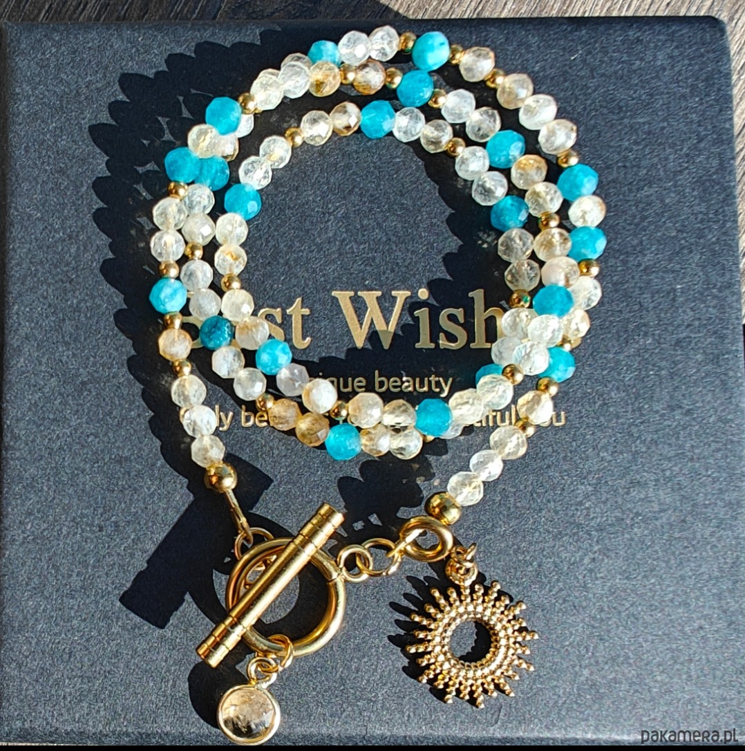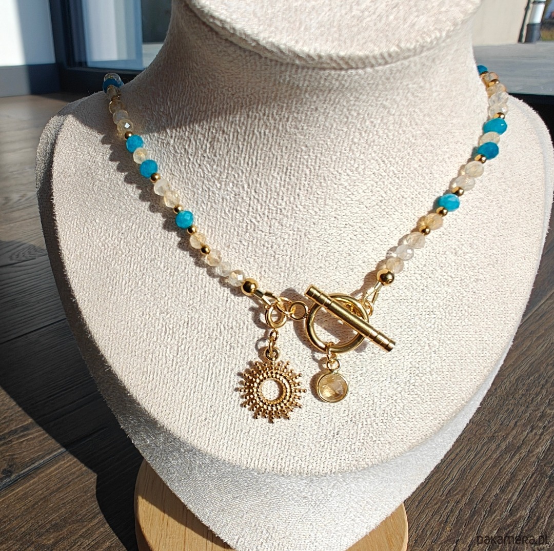 Delikatne połączenie ciepłego cytrynu i chłodnego chalcedonu tworzy naszyjnik pełen równowagi i blasku. Cytryn wnosi energię, radość i pewność siebie, a chalcedon działa uspokajająco, sprzyjając harmonii i wewnętrznemu spokojowi.