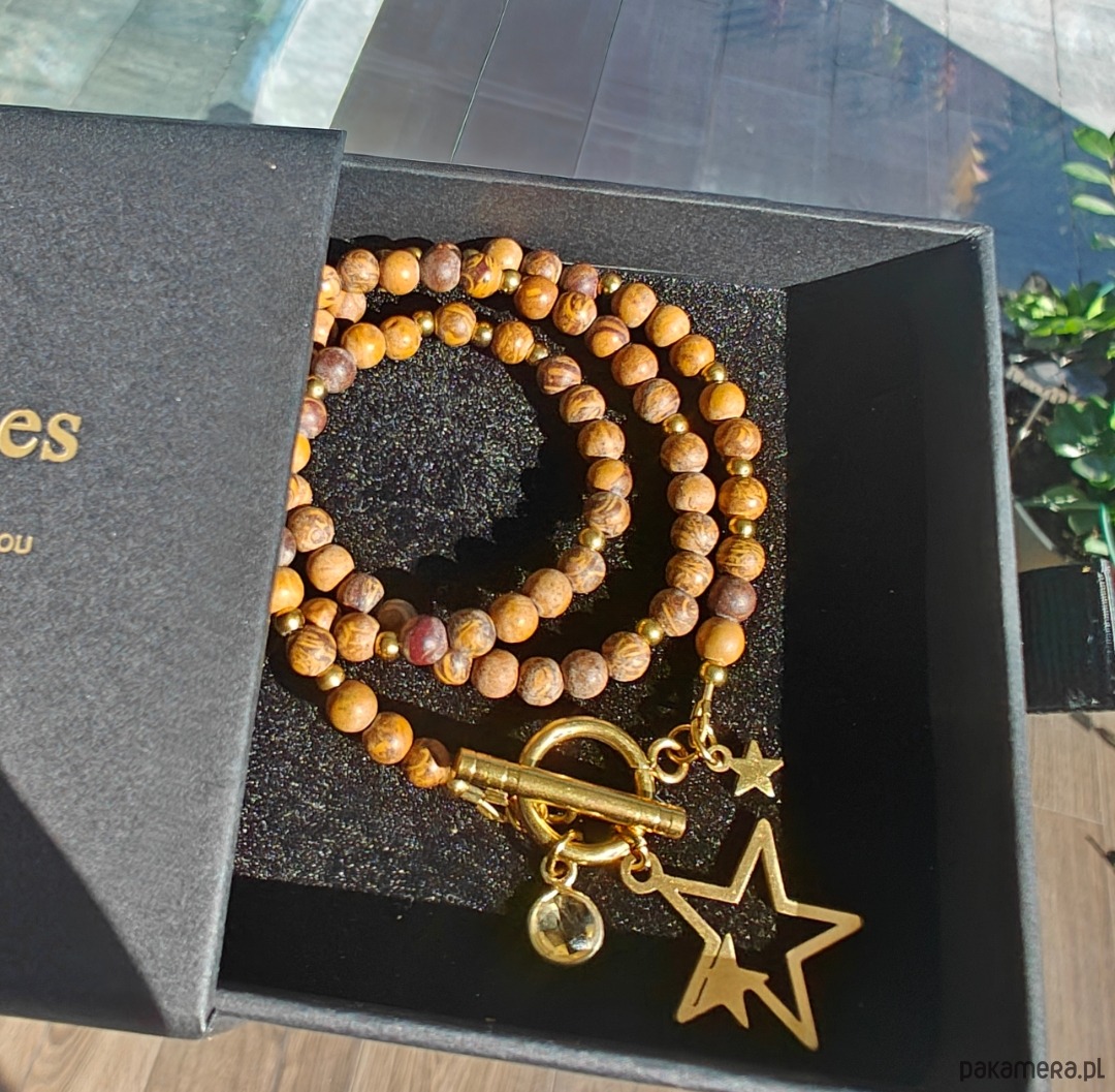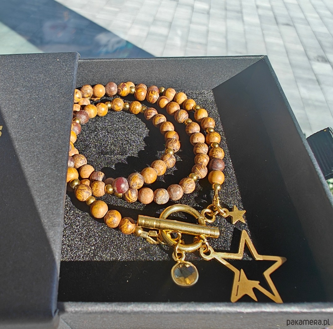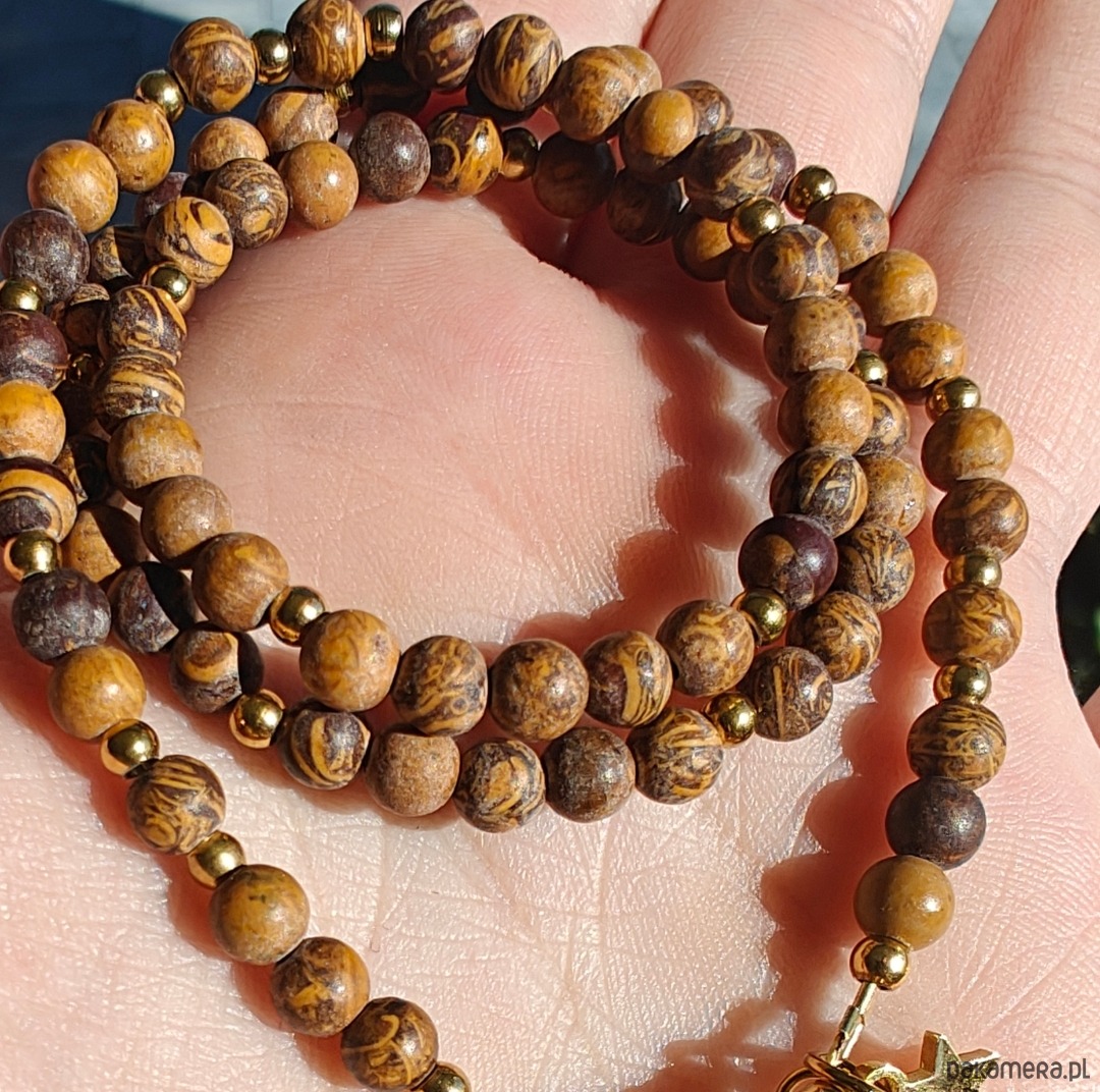 Naszyjnik wykonany z pięknego brązowego jaspisu o długości 43 cm, z zawieszką gwiazdy (ok. 2 cm) oraz dodatkową zawieszką z kamieniem cytrynu. Ciepła, ziemista kolorystyka połączona z subtelnym blaskiem tworzy wyjątkowo harmonijną kompozycję.