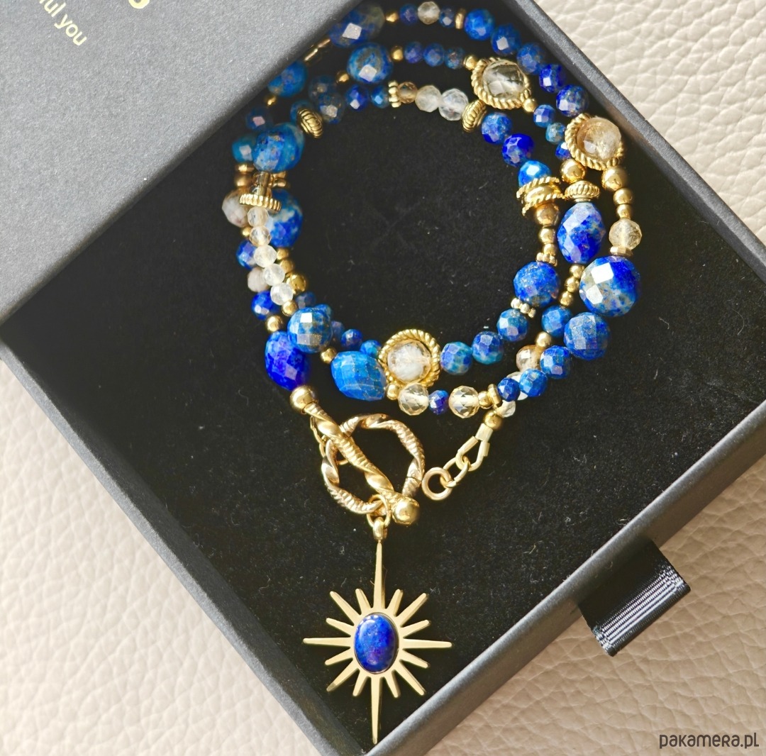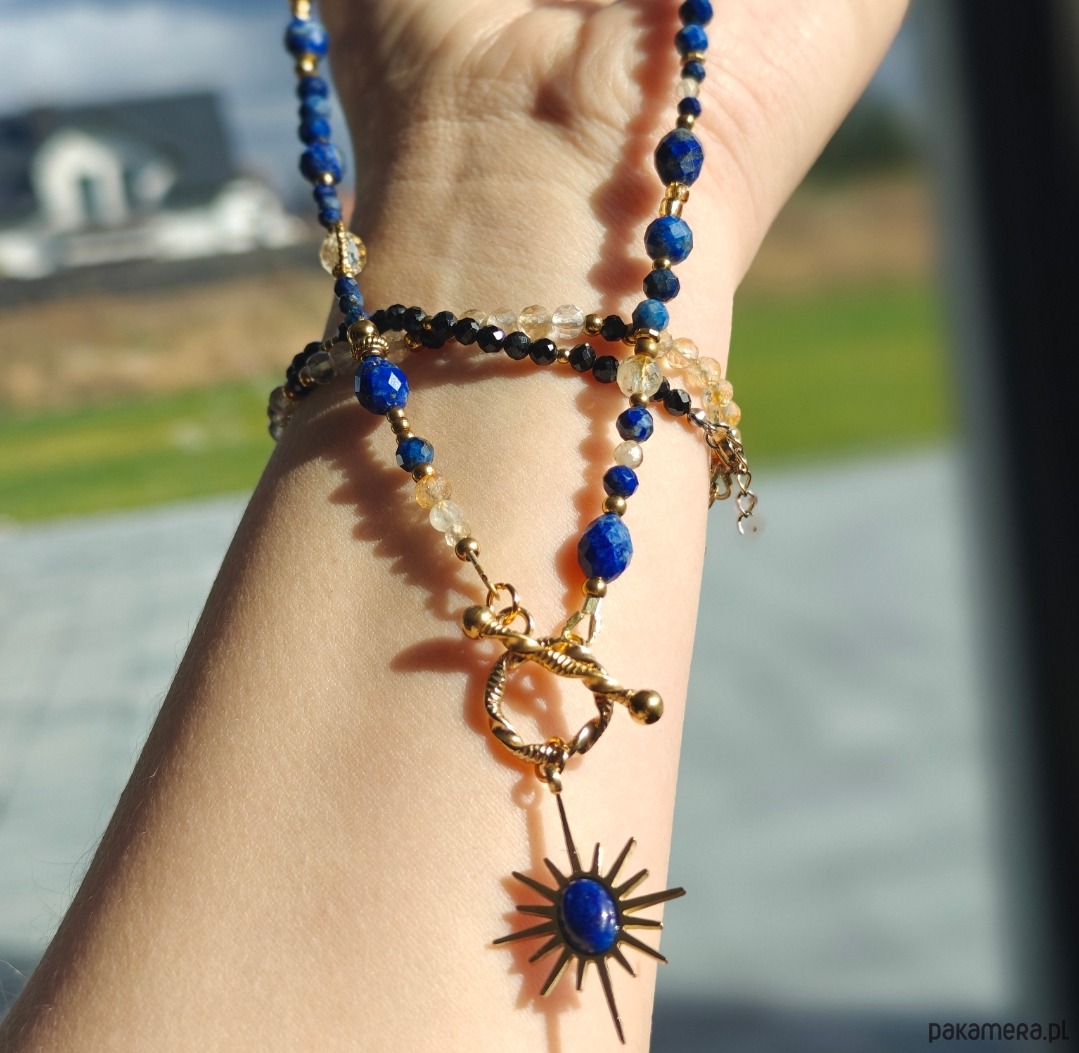 Eleganckie połączenie kamieni o wyjątkowej energii – głęboki granat lapis lazuli symbolizuje mądrość i wewnętrzny spokój, cytryn dodaje pewności siebie i optymizmu, a kryształ górski wzmacnia ich działanie, wprowadzając harmonię i klarowność.