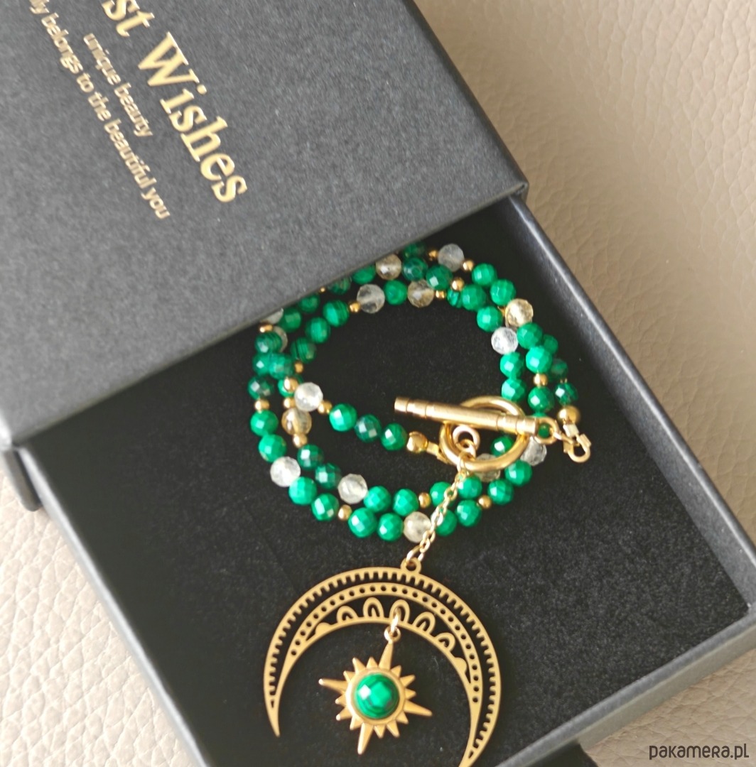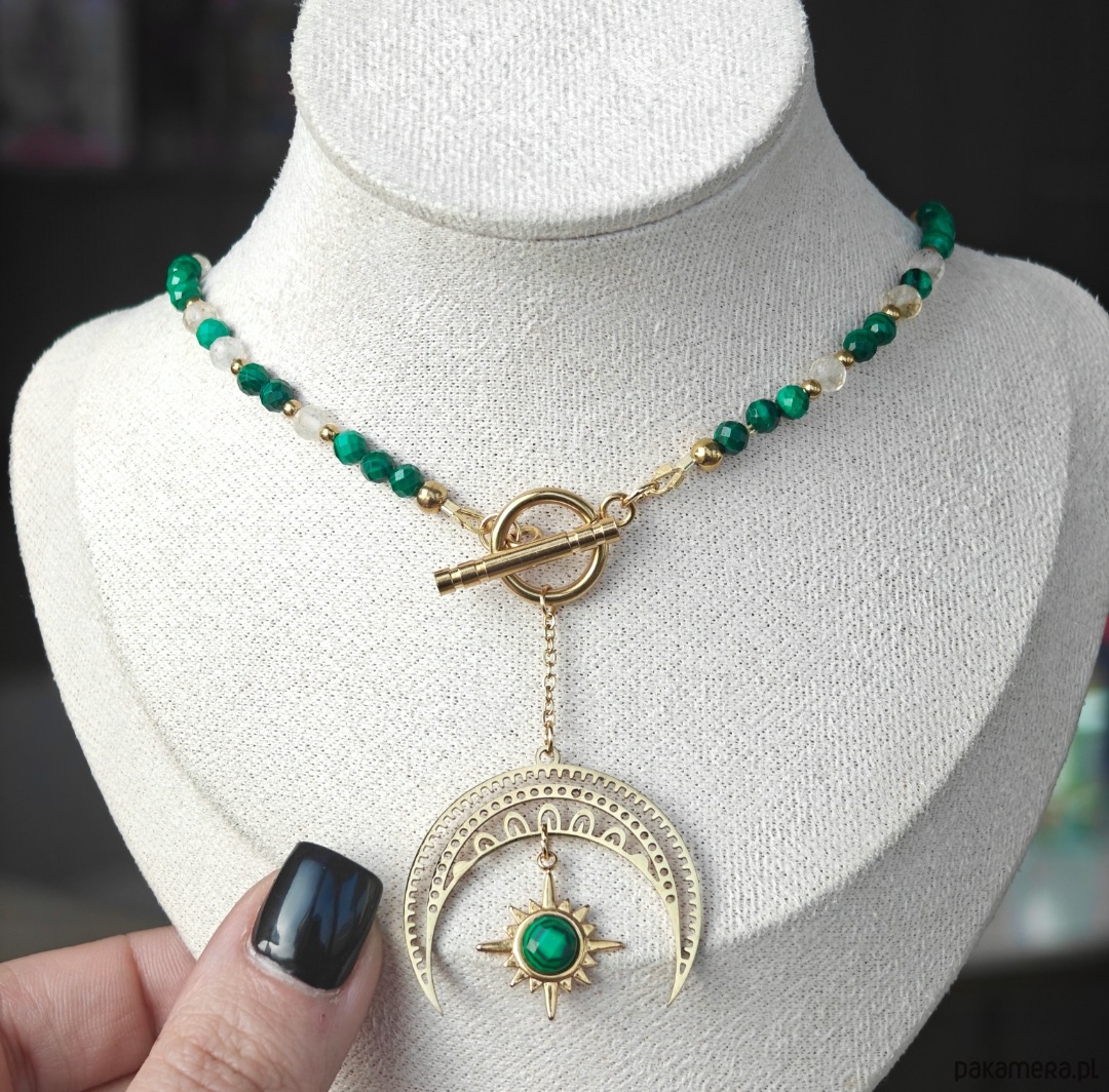 Naszyjnik ma 38 cm oraz 5 cm zawieszki w formie subtelnej lunuli z kamieniem, umieszczonej na delikatnym łańcuszku. Połączenie malachitu, cytrynu i symbolu księżyca tworzy wyjątkowy, kobiecy amulet.