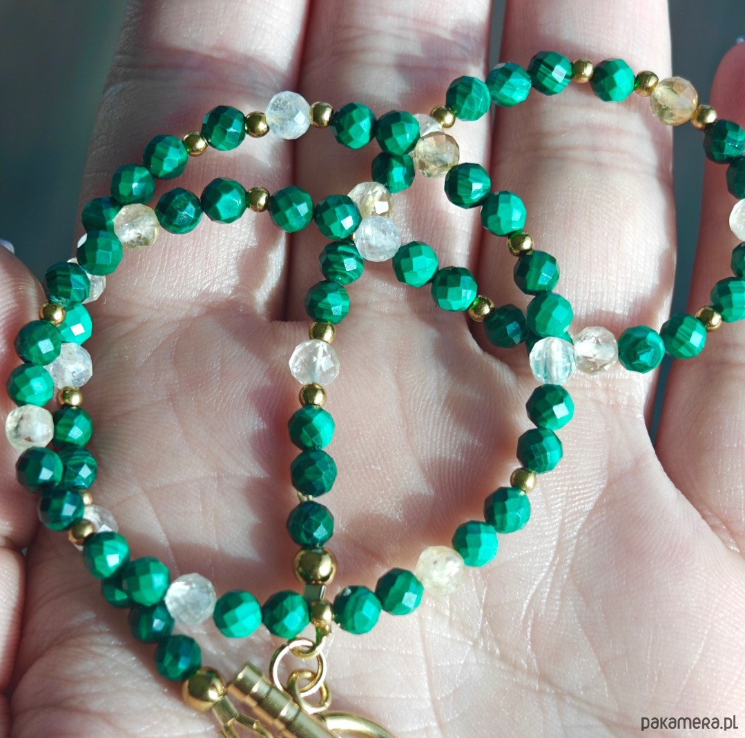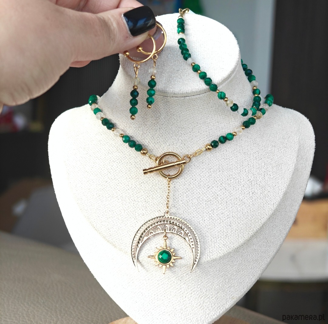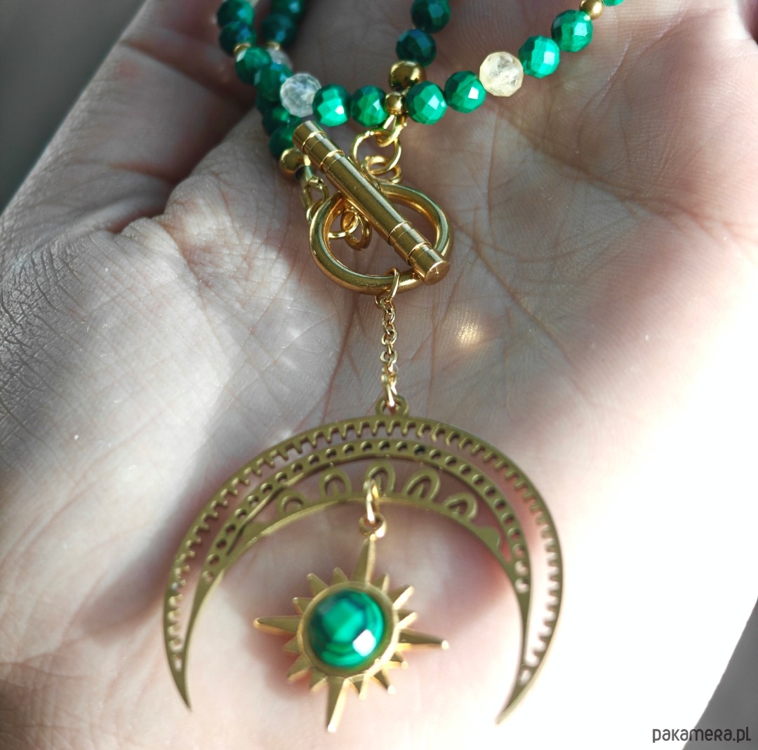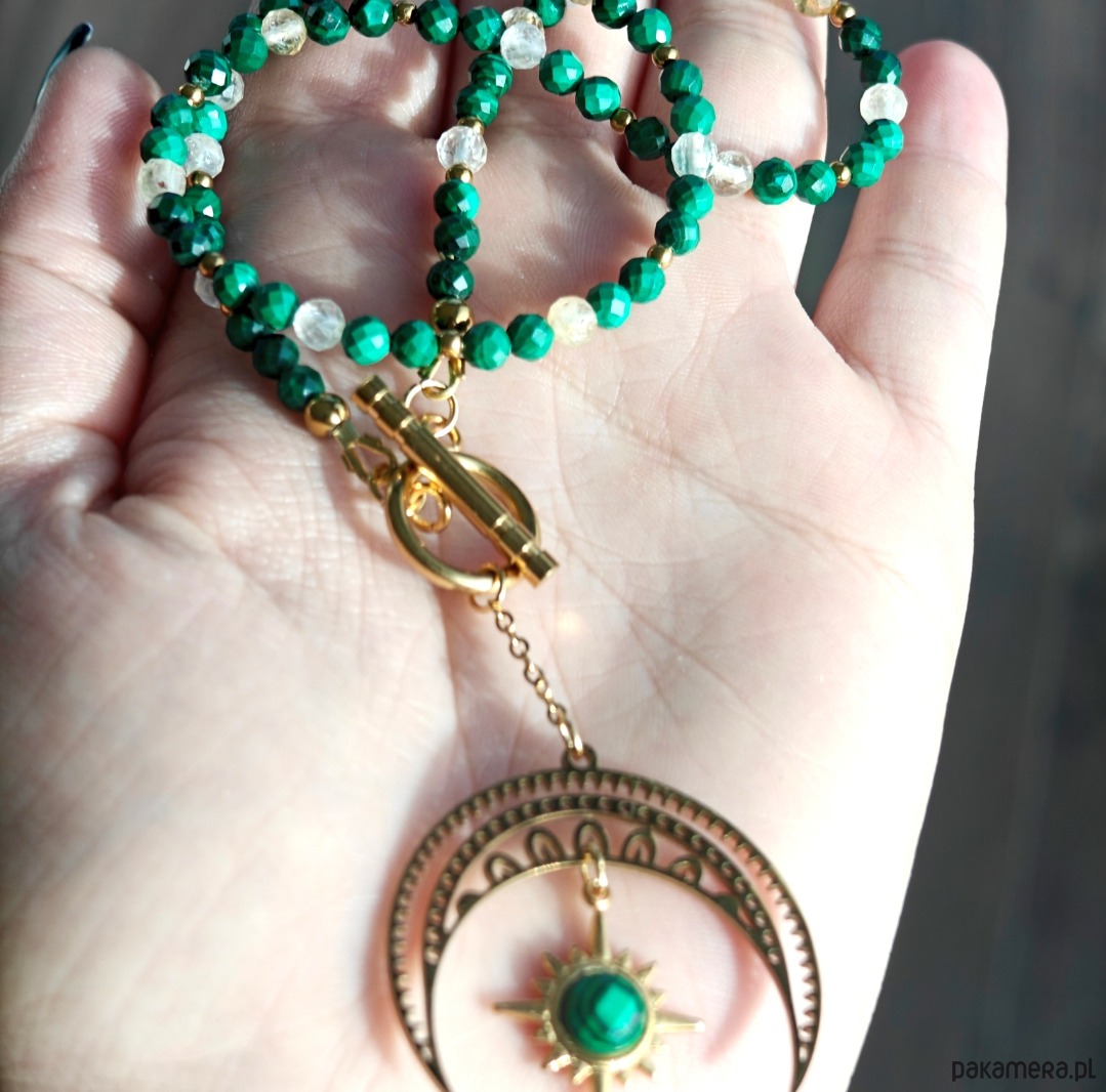 Naszyjnik z malachitu i cytrynu z lunulą na łańcuszku