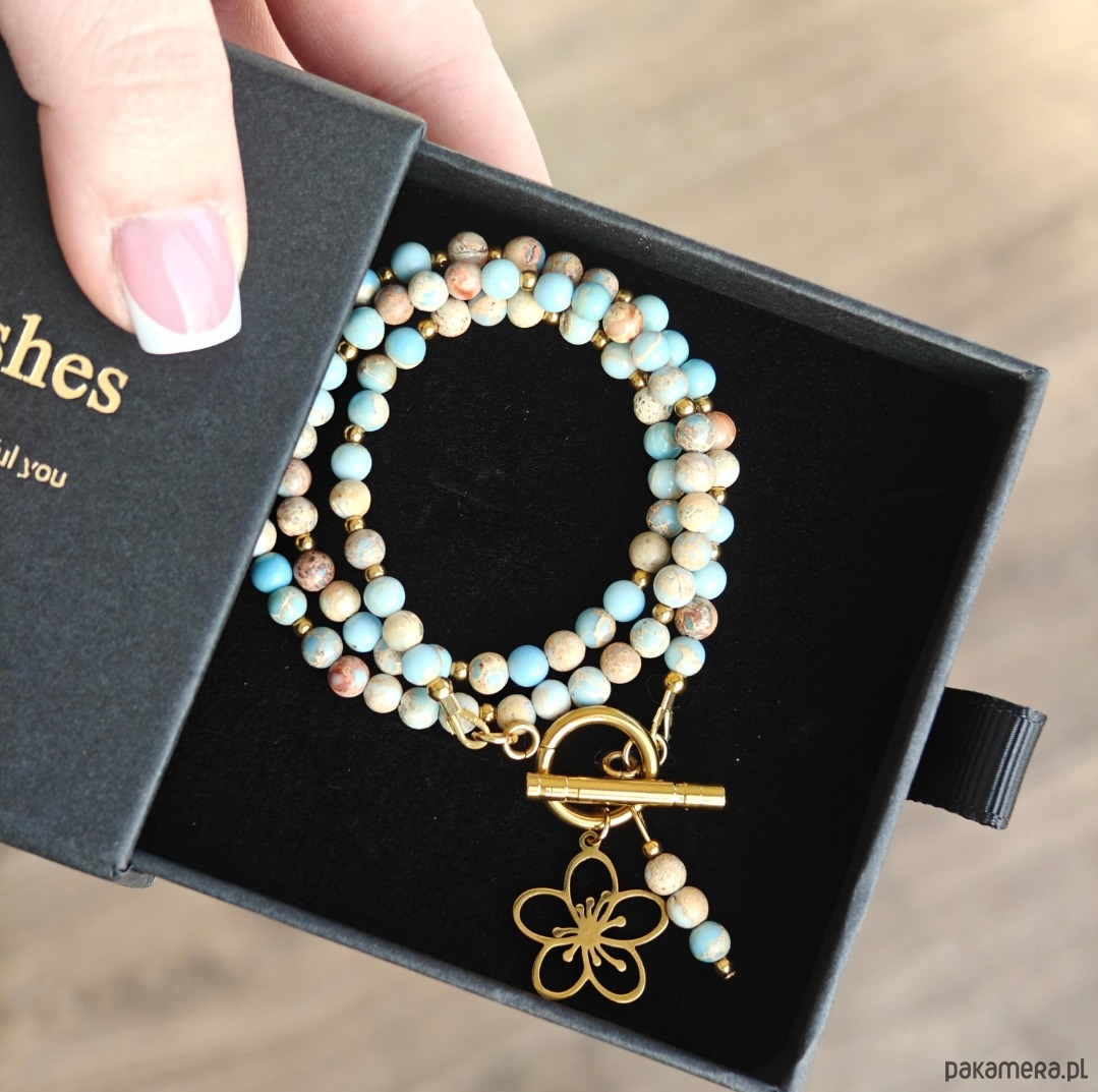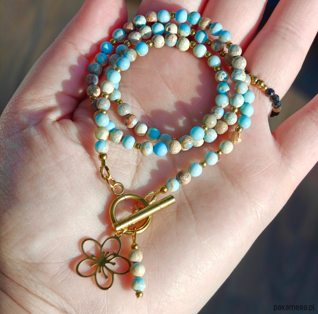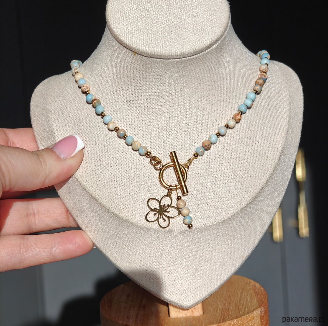 Naszyjnik ma długość 44 cm, a delikatna, 2-centymetrowa zawieszka w kształcie kwiatka wykonana ze stali chirurgicznej stanowi subtelny, symboliczny akcent. Całość uzupełniają przekładki ze stali chirurgicznej w kolorze złota oraz drobne elementy ze srebra pozłacanego, które dodają biżuterii ciepła i elegancji.