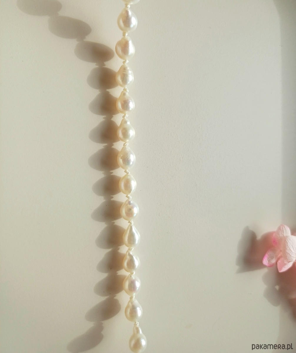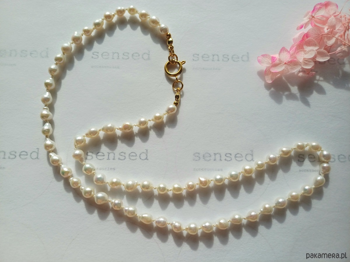 Długi, klasyczny naszyjnik z pereł słodkowodnych w delikatnym, kremowym odcieniu. Supełki oddzielają poszczególne perły i podkreślają je.