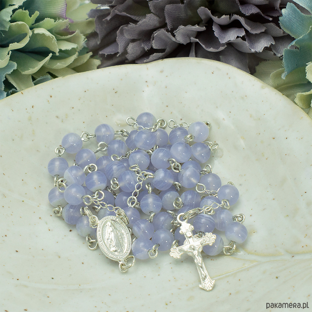 Różaniec wykonany ręcznie z naturalnego chalcedonu oraz ze srebra próby 925. Pomysł na piękny prezent na chrzest, komunię, bierzmowanie, itd.
