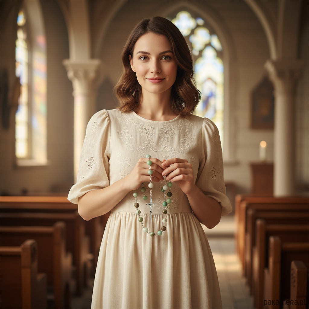 Klasyczny różaniec, RĘKODZIEŁO, I Komunia Św., SREBRO 925, chryzopraz 6mm
