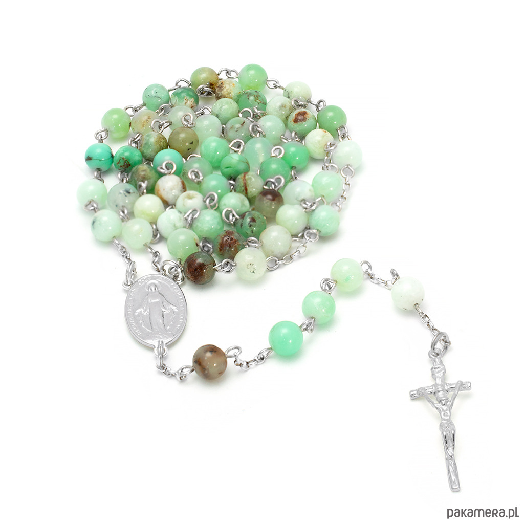 Różaniec wykonany ręcznie z wysokiej jakości naturalnego chryzoprazu oraz ze srebra próby 925. Zapakowany ozdobnie. Pomysł na piękny prezent na chrzest, komunię, bierzmowanie, itd.