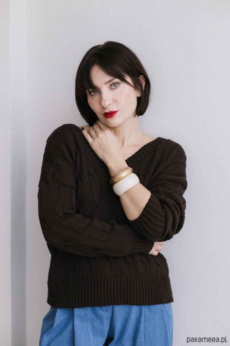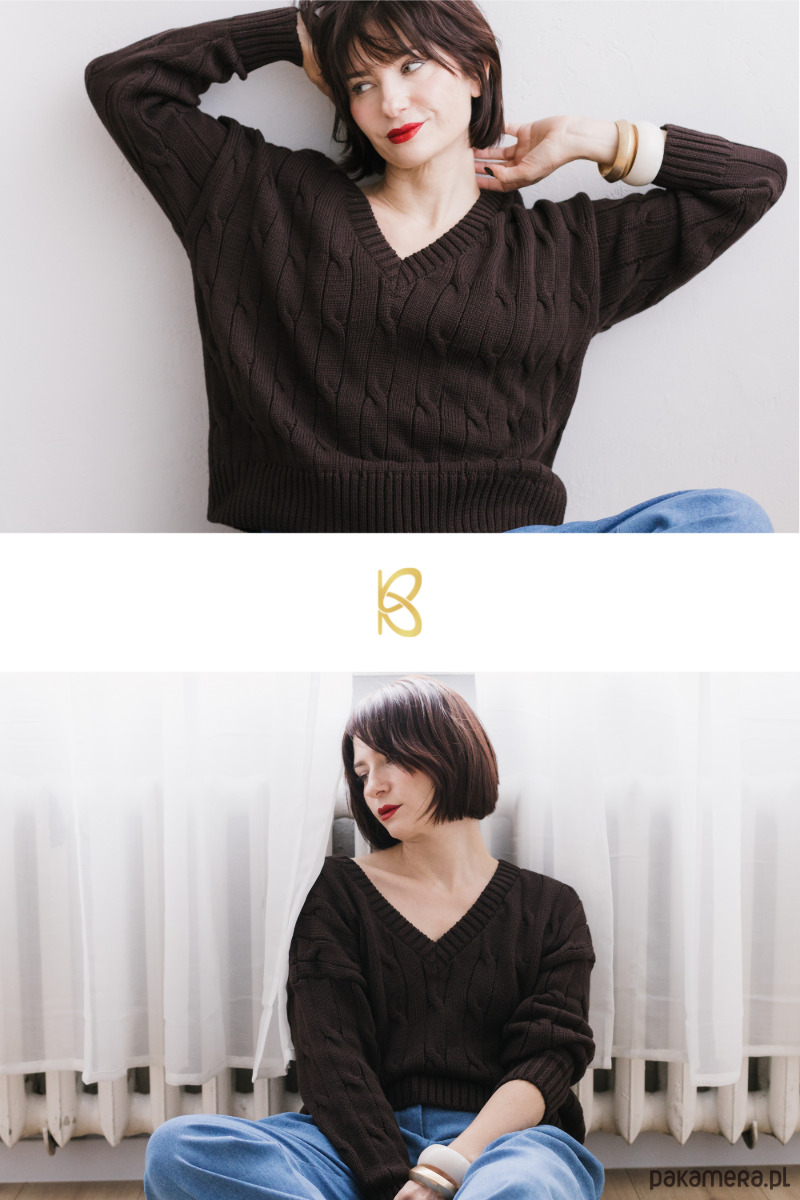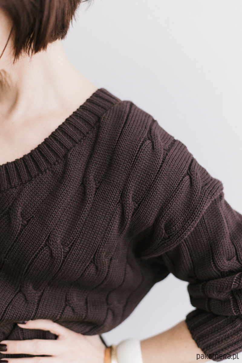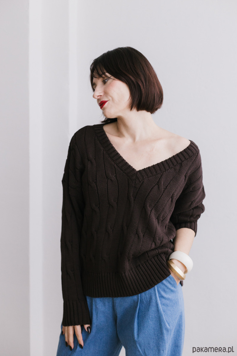 Klasyczny sweter w warkocze, z dekoltem w serek, czekoladowy