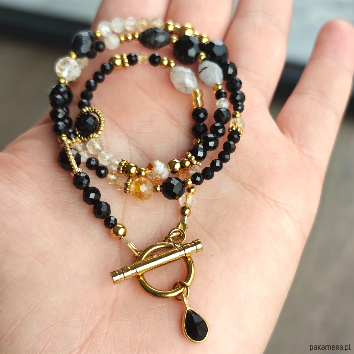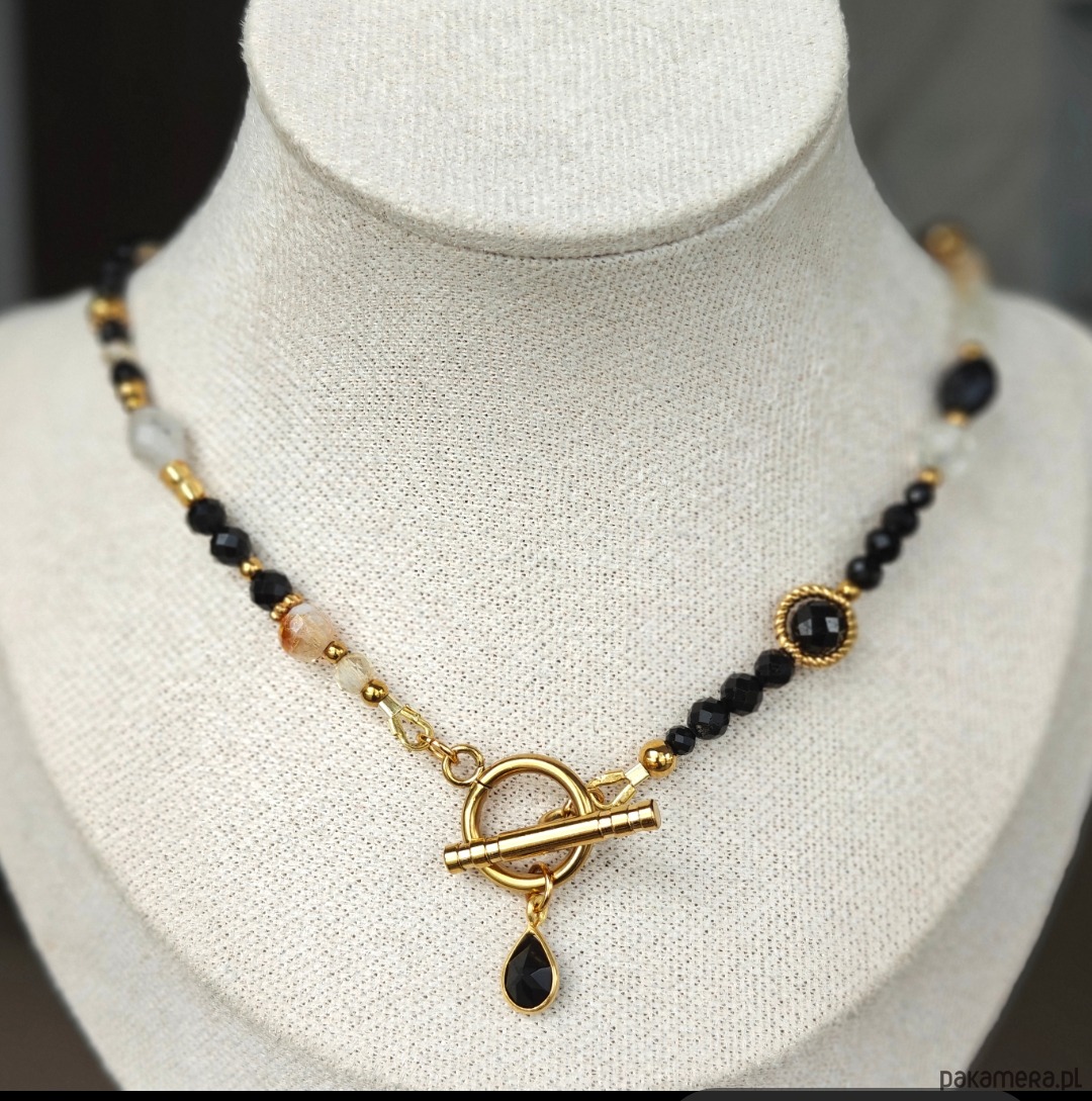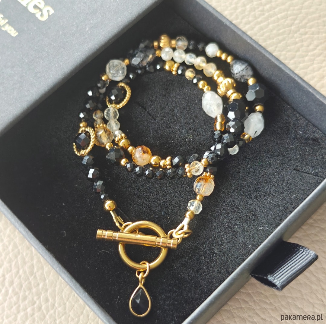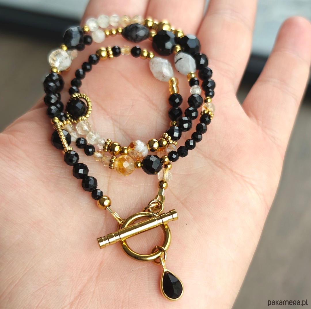 Naszyjnik wykonany z połączenia czarnego turmalinu, cytrynu i kryształu górskiego. Ma 41 cm a zapięciem i zawieszką 44 cm. Drobne elementy ze stali chirurgicznej i srebra pozłacanego dodają całości subtelnego blasku. Biżuteria zapakowana jest w eleganckie pudełko, dzięki czemu idealnie sprawdzi się również jako prezent
