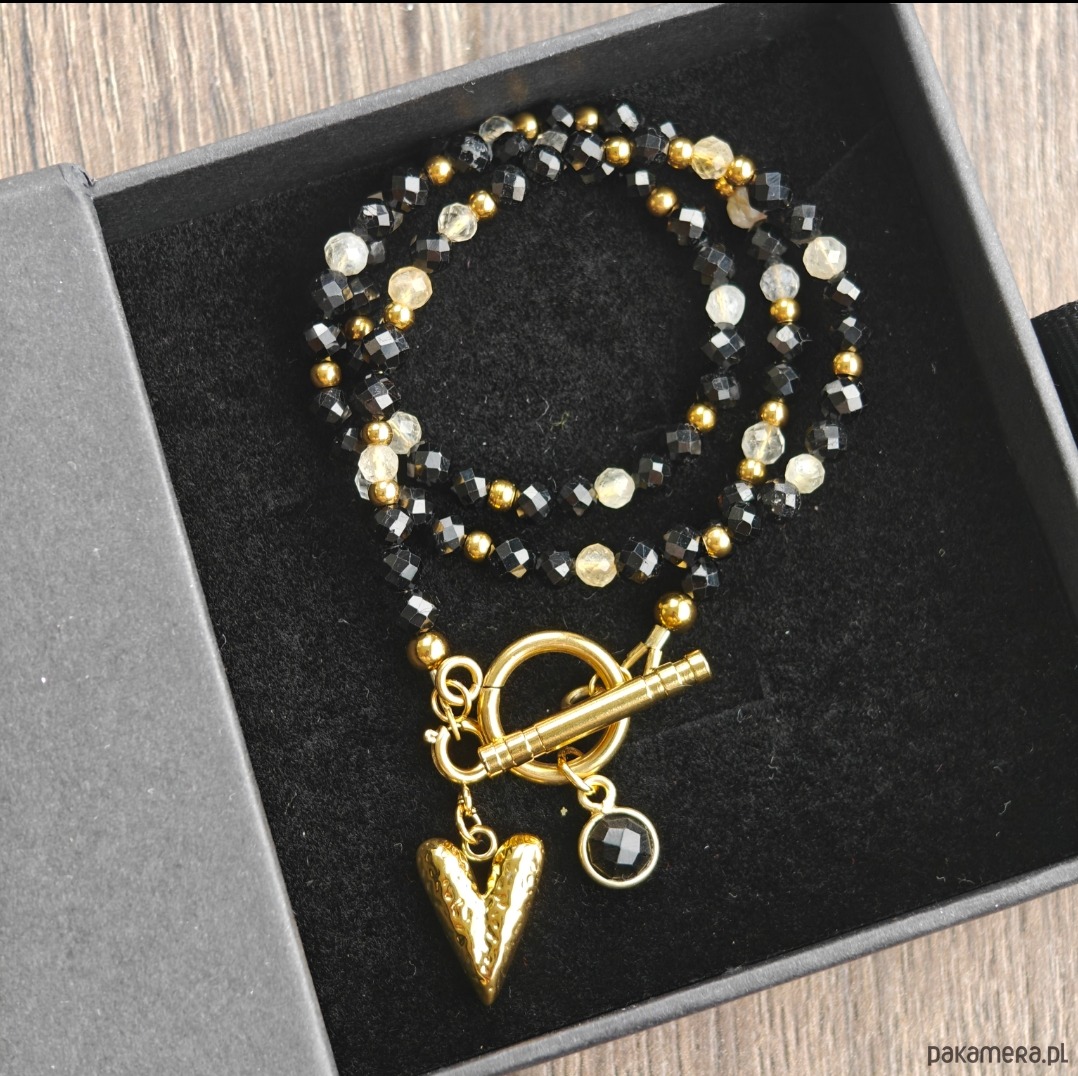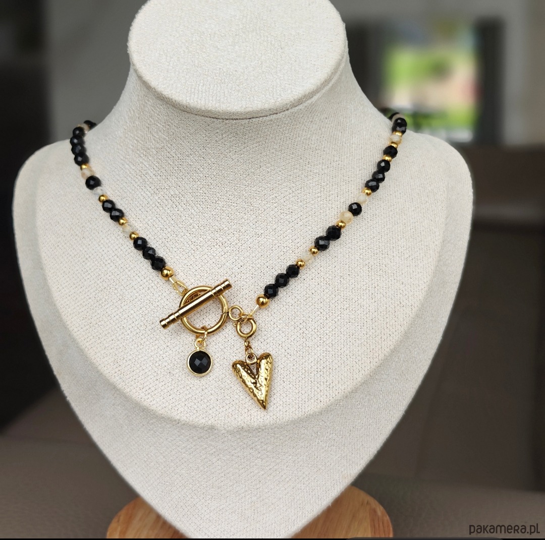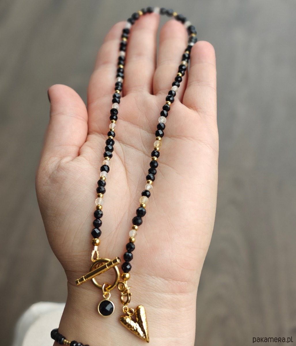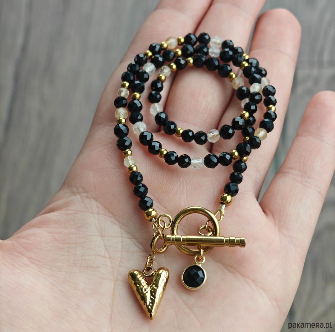 Naszyjnik wykonany z czarnego turmalinu i cytrynu, uzupełniony elementami ze stali chirurgicznej oraz drobnymi akcentami ze srebra pozłacanego. Jego długość to 39 cm w obwodzie, a z zapięciem i zawieszką – 41 cm. Całość dopełnia efektowna zawieszka w kształcie serca, którą można odpinać i modyfikować naszyjnik w zależności od okazji i stylizacji. Naszyjnik pakowany jest w eleganckie pudełko, dzięki czemu świetnie sprawdzi się również jako prezent. 🎁✨