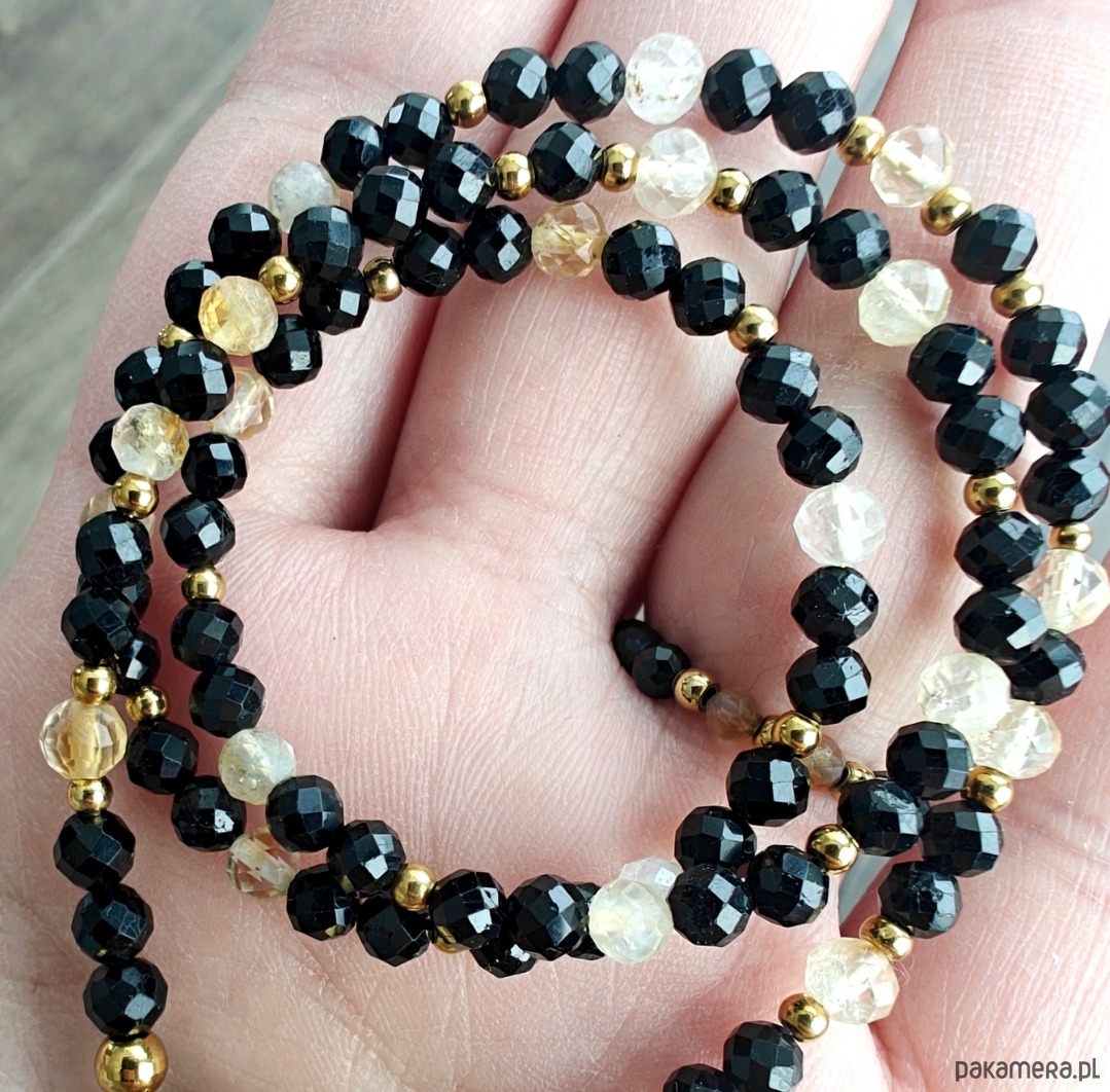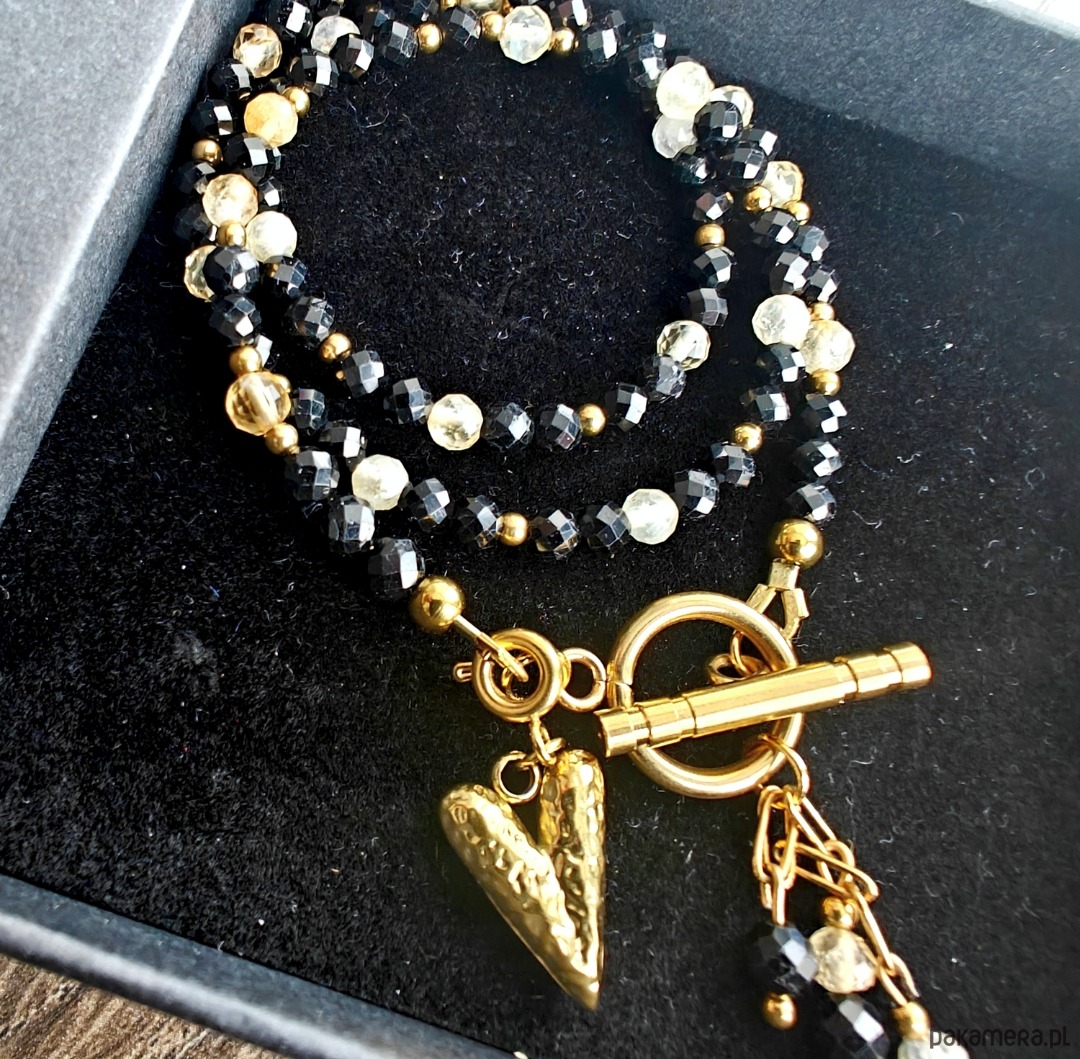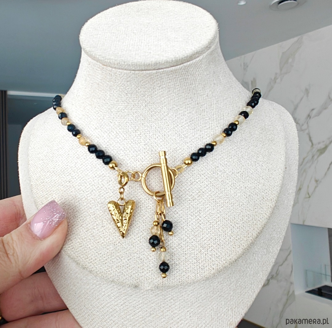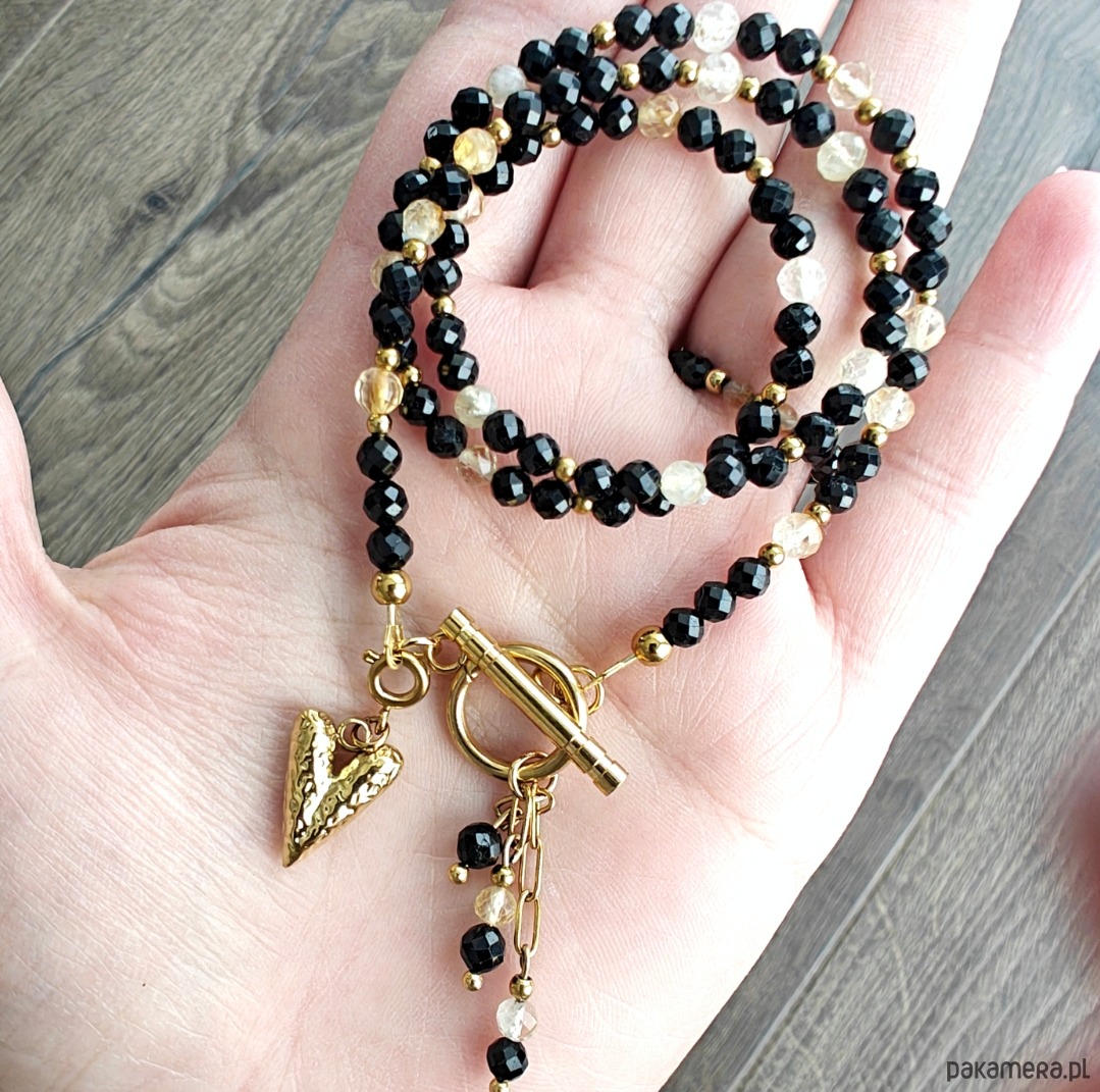 Naszyjnik wykonany z naturalnych kamieni: turmalinu oraz cytrynu, o długości 43 cm, z zawieszką o długości około 3 cm. Zawieszka serca jest odpinana, co pozwala nosić naszyjnik na dwa sposoby – z sercem jako wyrazistym akcentem lub bez zawieszki w bardziej minimalistycznej wersji.