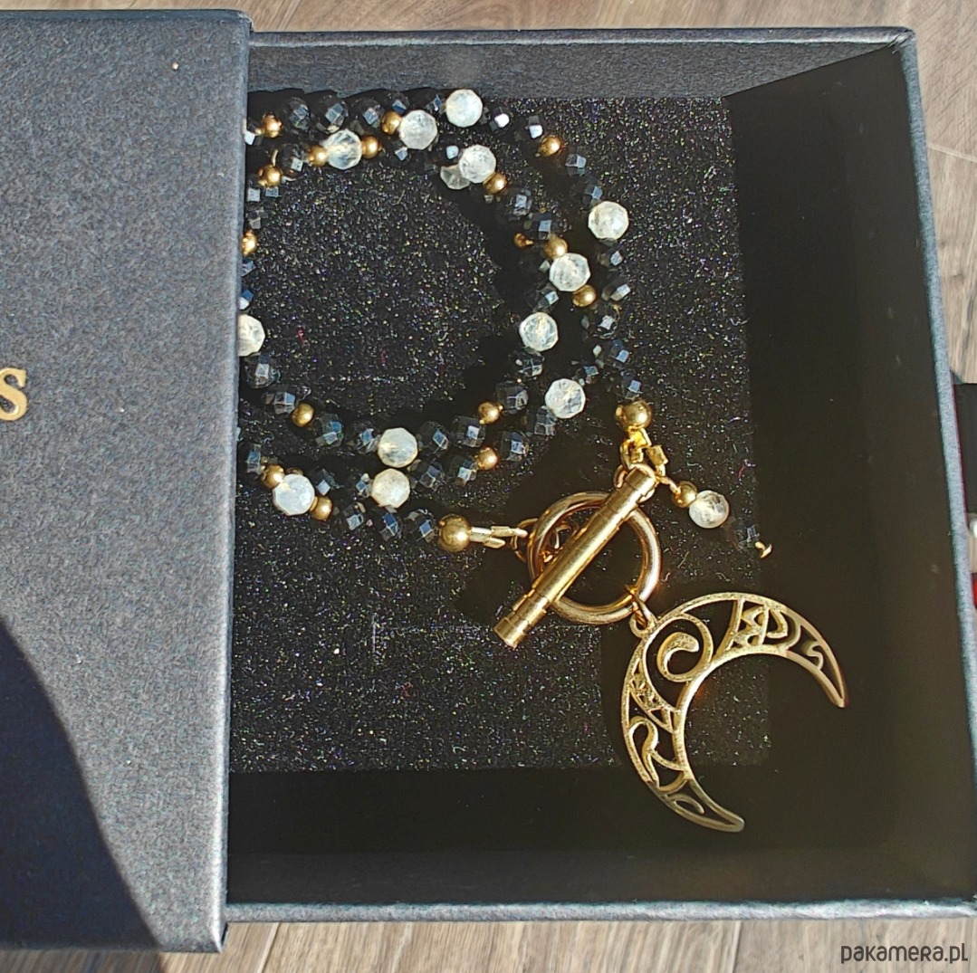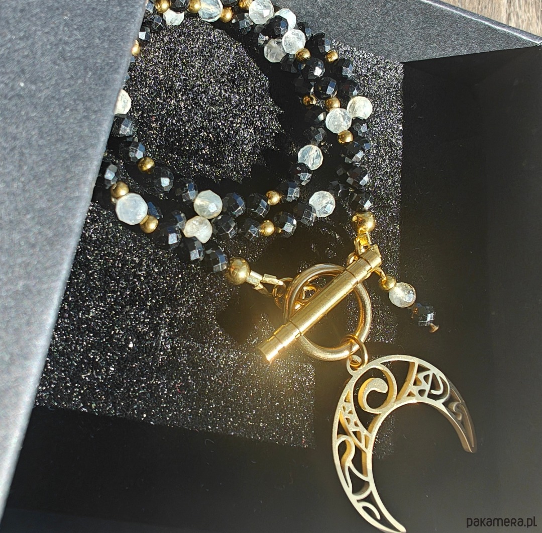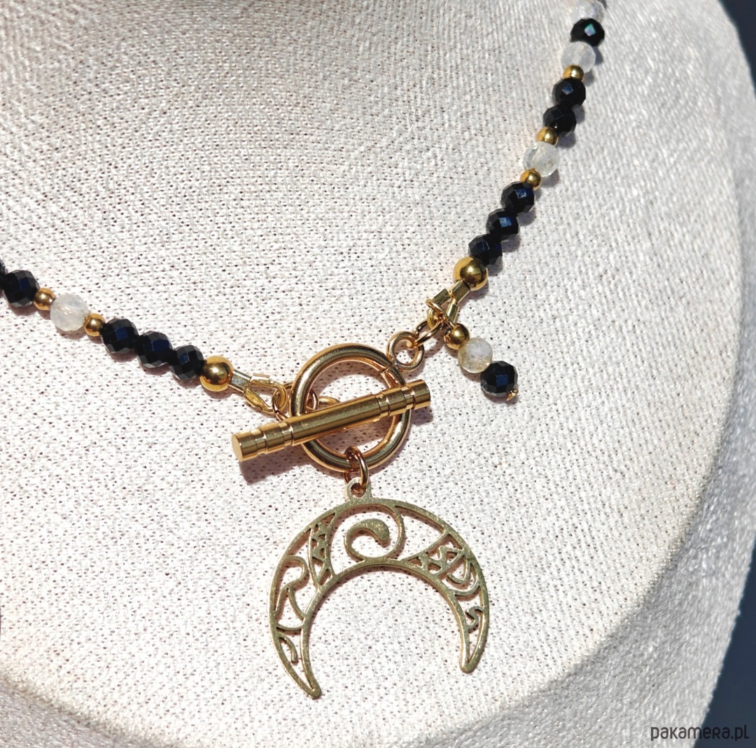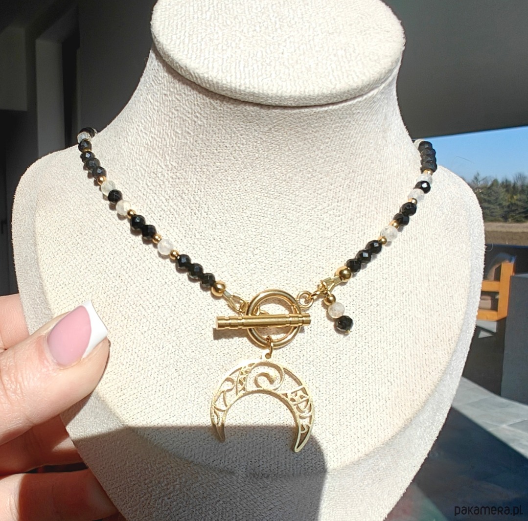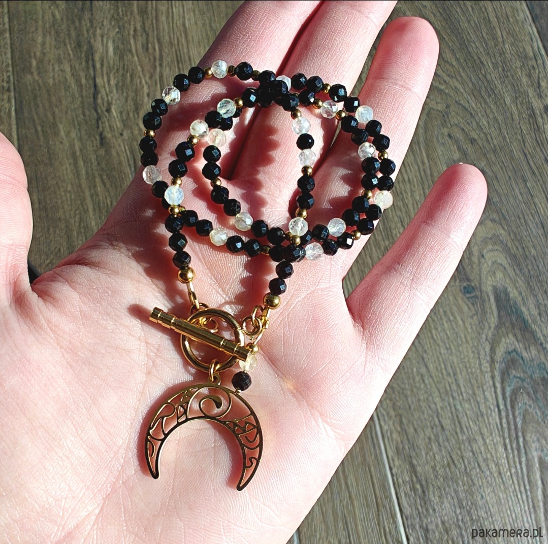 Naszyjnik wykonany z turmalinu i cytrynu o długości 40 cm, z zawieszką w kształcie lunuli (księżyca) o długości ok. 2 cm. Subtelne połączenie kontrastujących energii zamknięte w delikatnej, kobiecej formie.