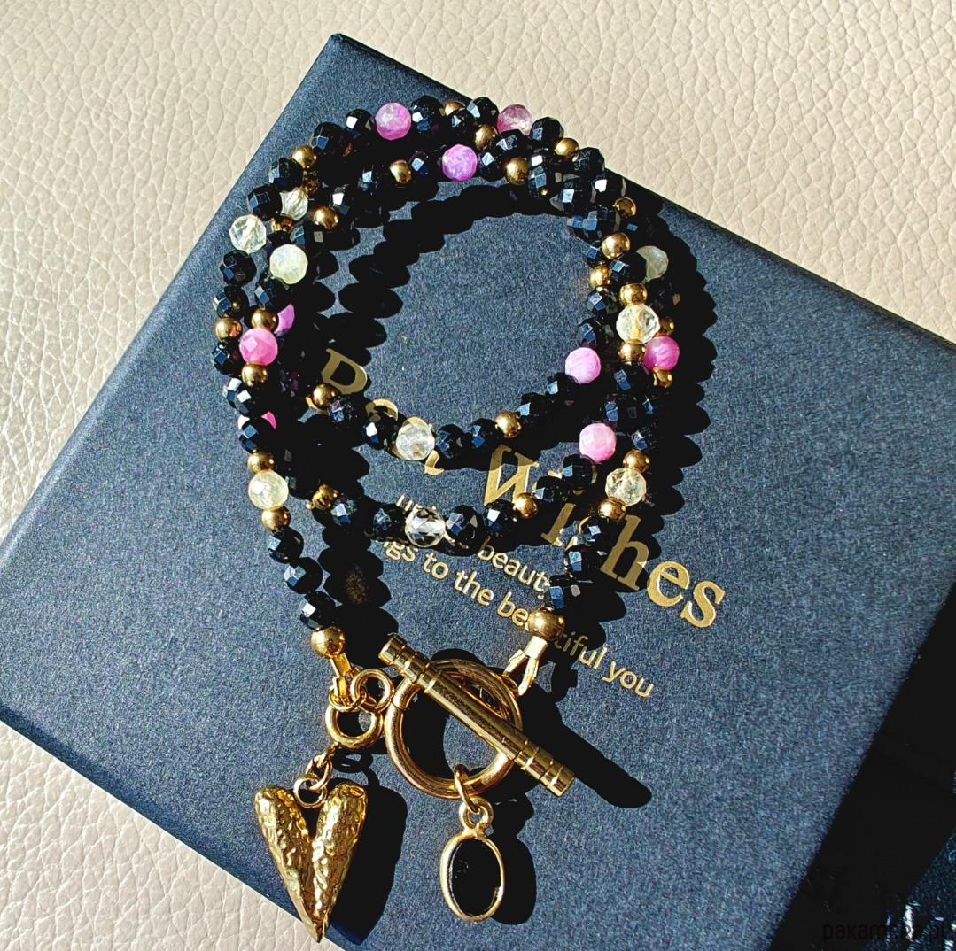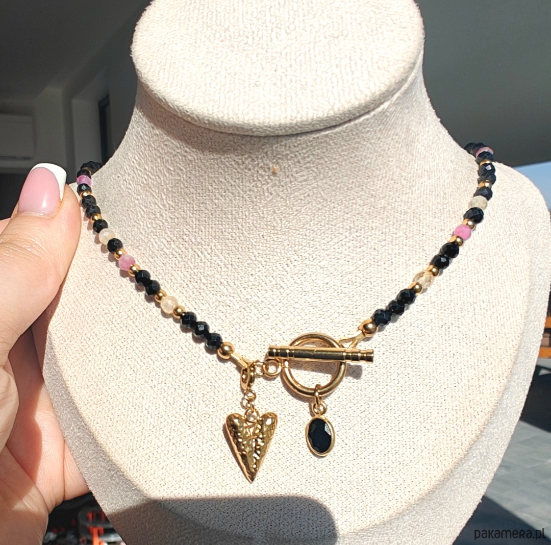 Naszyjnik wykonany z czarnego turmalinu, różowego turmalinu oraz cytrynu o długości 42 cm, z odpinaną zawieszką serca o długości ok. 1 cm. Możesz nosić go klasycznie lub w wersji minimalistycznej — bez zawieszki.