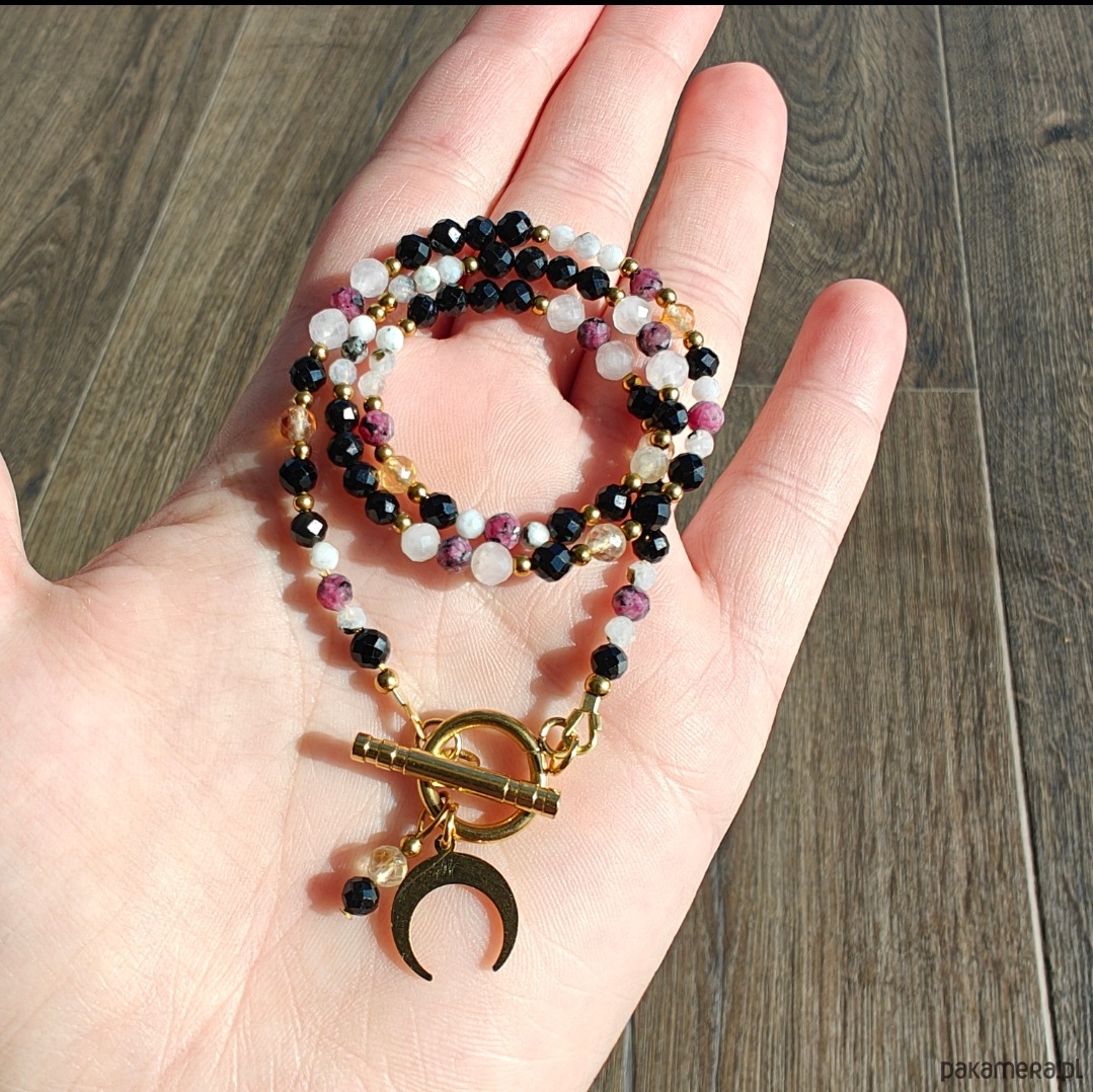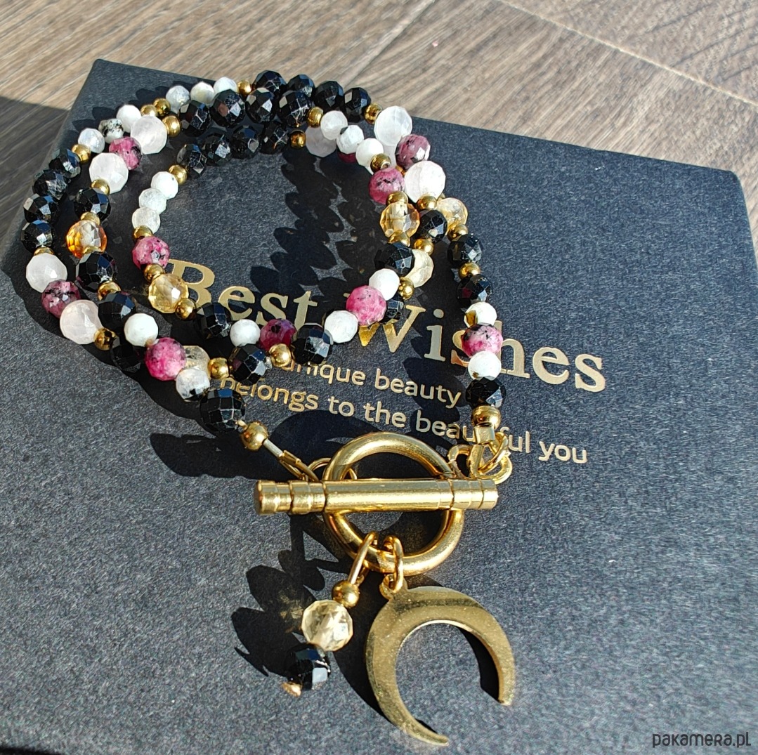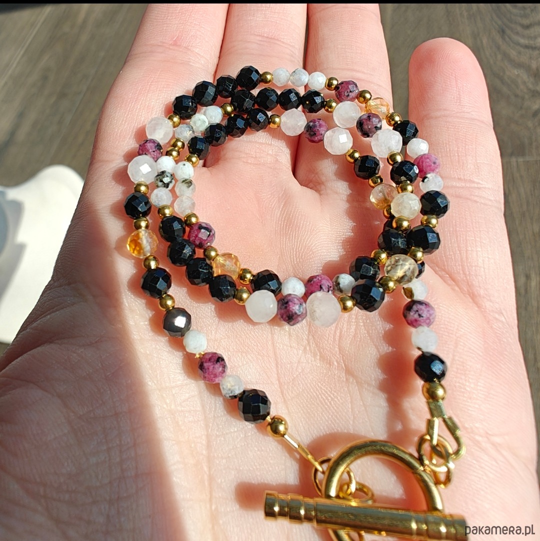 Wyjątkowe połączenie barw i energii — czarny turmalin chroni i uziemia, różowy turmalin wnosi delikatność i spokój, cytryn dodaje optymizmu, a kamień księżycowy podkreśla kobiecą intuicję i subtelność. Razem tworzą harmonijną kompozycję pełną blasku i znaczenia.