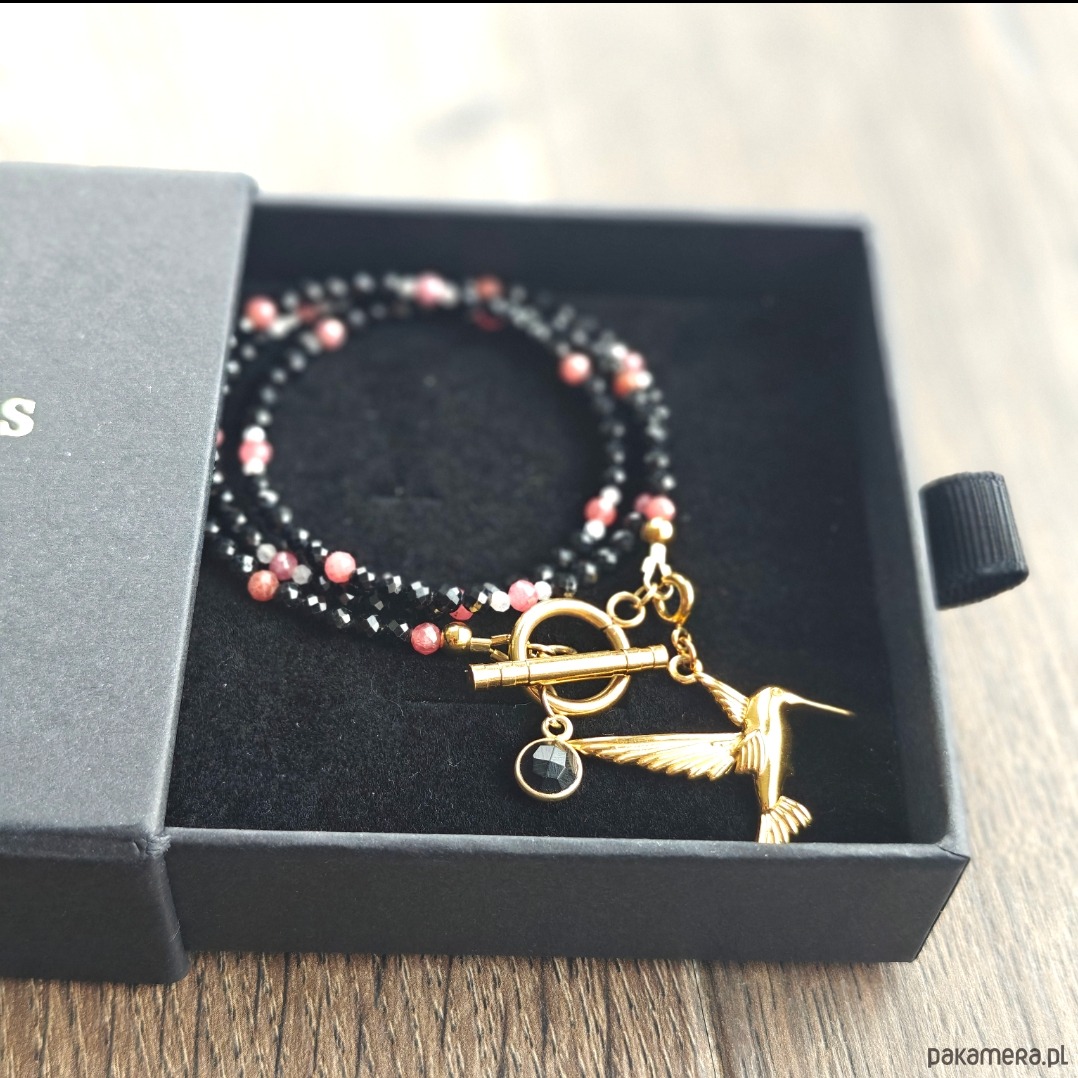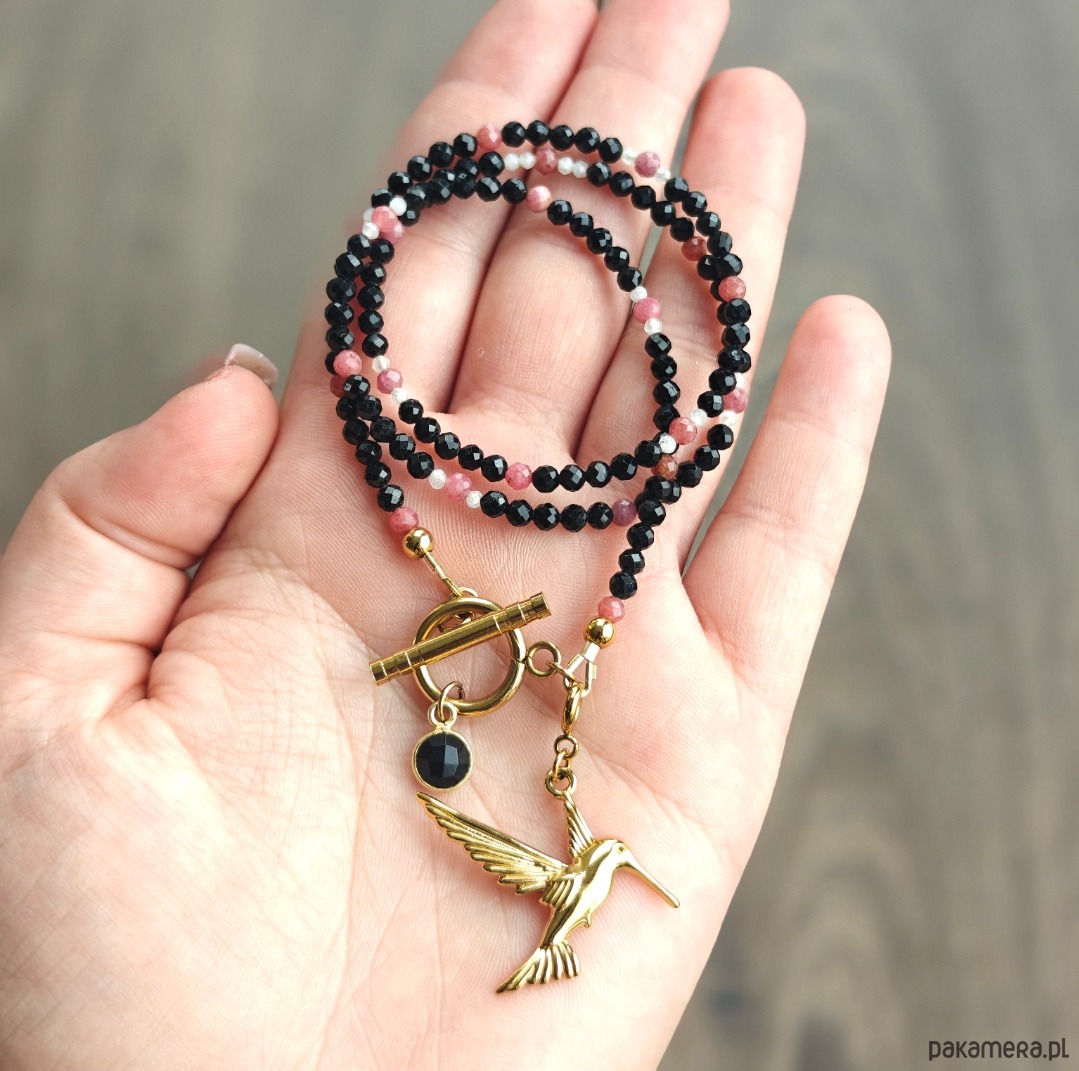 Naszyjnik wykonany z czarnego turmalinu, rodonitu oraz kamienia księżycowego, uzupełniony elementami ze stali chirurgicznej i subtelnymi akcentami ze srebra pozłacanego. Długość naszyjnika wynosi 45 cm w obwodzie, a z zapięciem i zawieszką – 48 cm. Całość dopełnia odpinana zawieszka w kształcie kolibra, która pozwala na łatwą modyfikację i dopasowanie naszyjnika do różnych stylizacji. Naszyjnik pakowany jest w eleganckie pudełko, dzięki czemu idealnie nadaje się również na prezent. 🎁✨