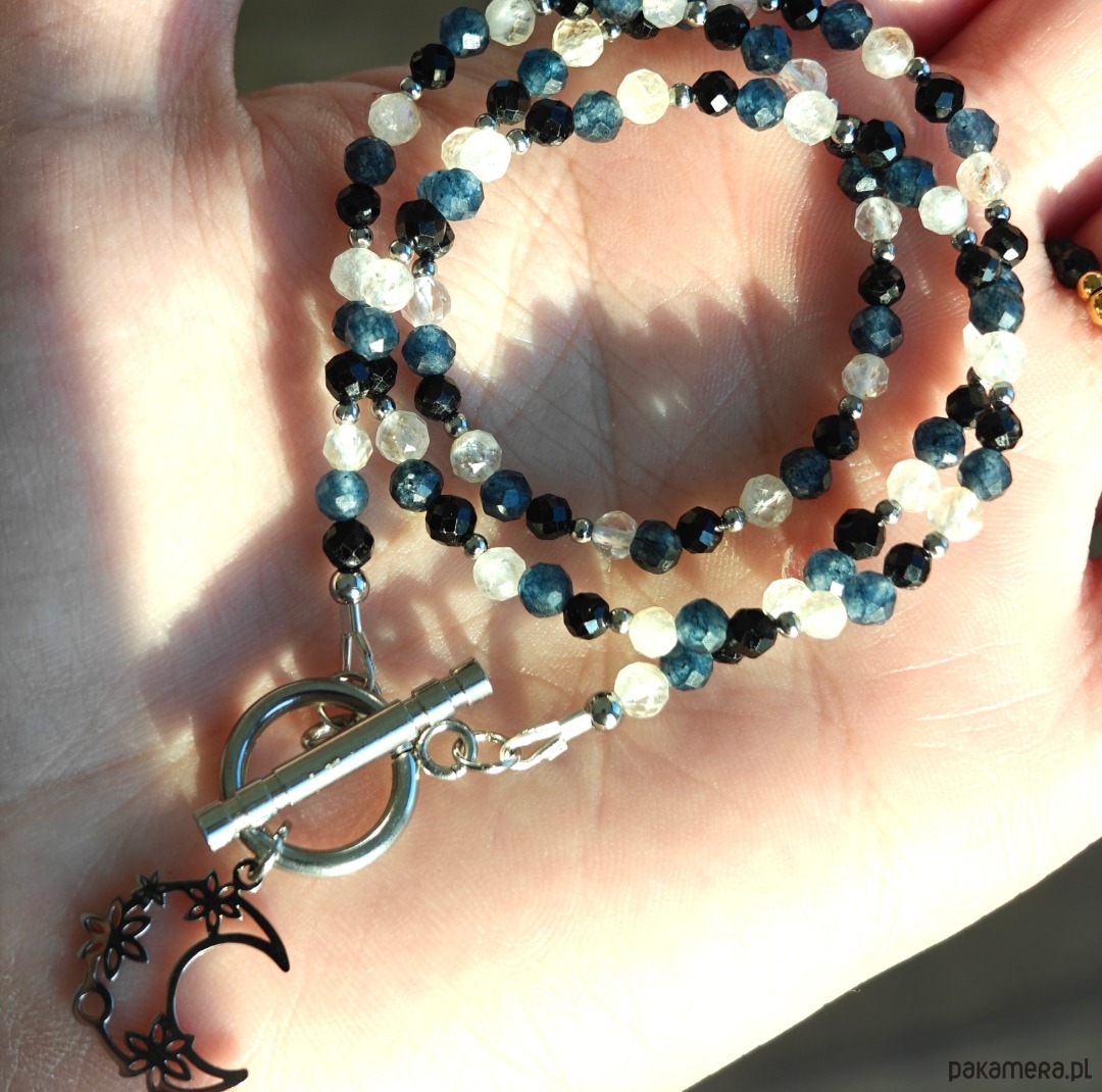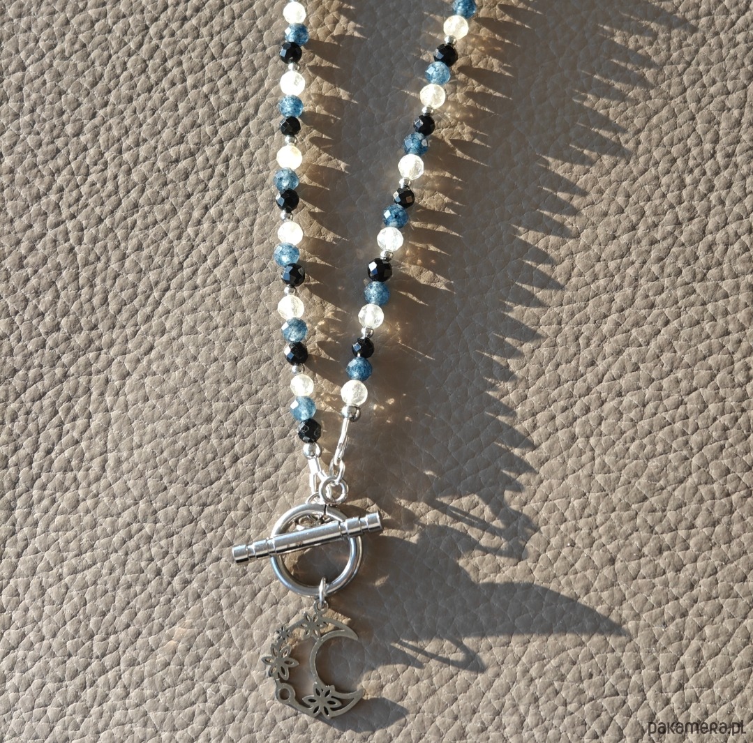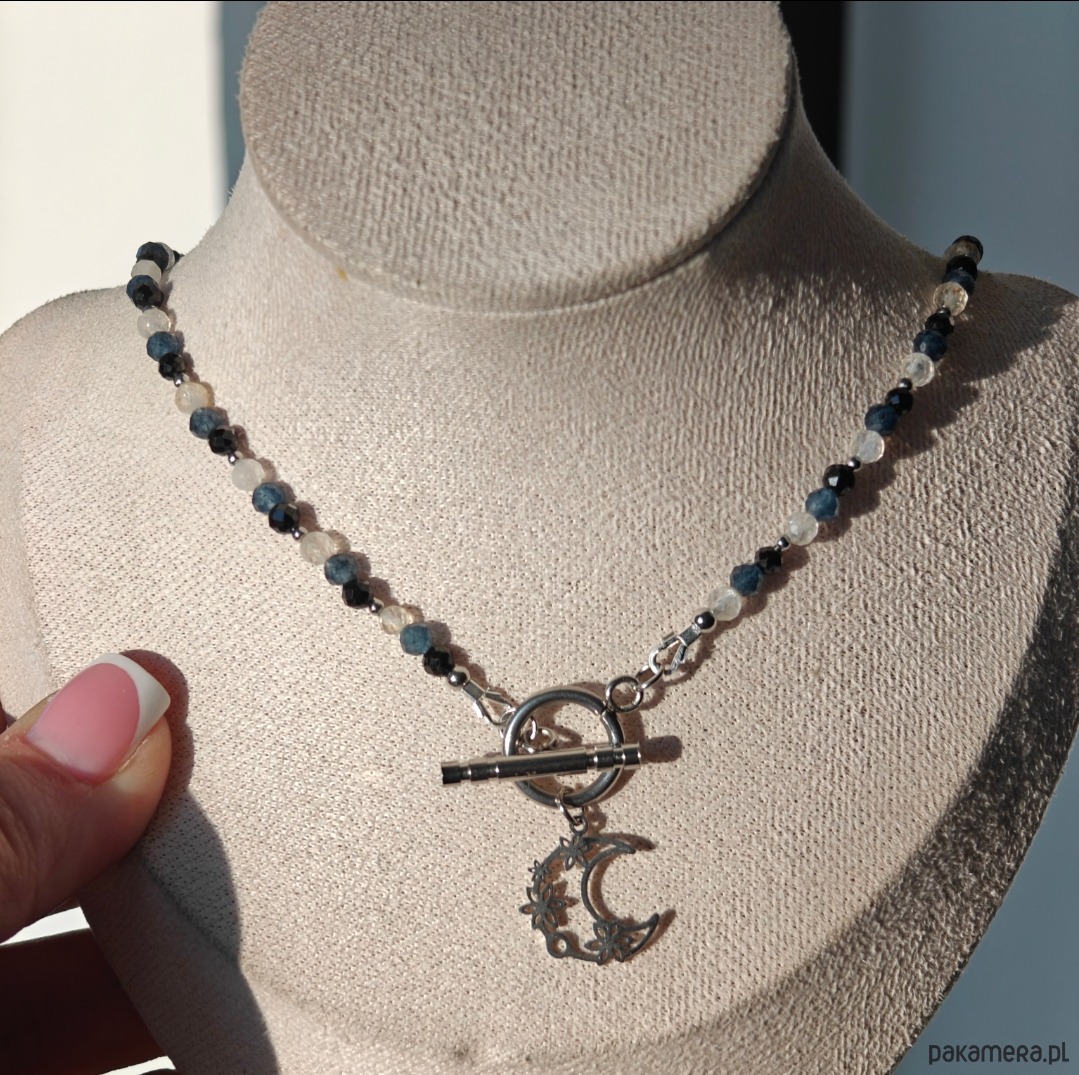 Ten naszyjnik z motywem księżyca to subtelna, krótsza wersja biżuterii inspirowanej symboliką nieba i naturalnych kamieni. Długość 42 cm oraz dodatkowe 2 cm zawieszki w kształcie księżyca sprawiają, że delikatnie podkreśla linię szyi i pięknie dopełnia codzienne stylizacje.