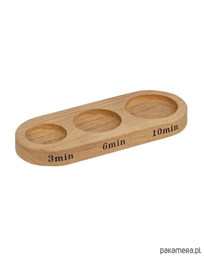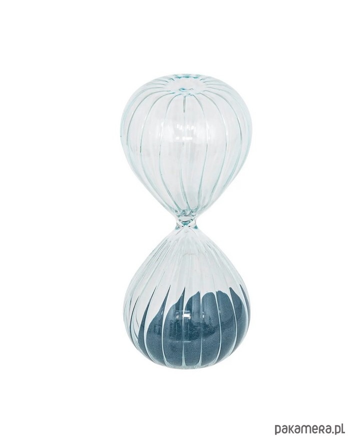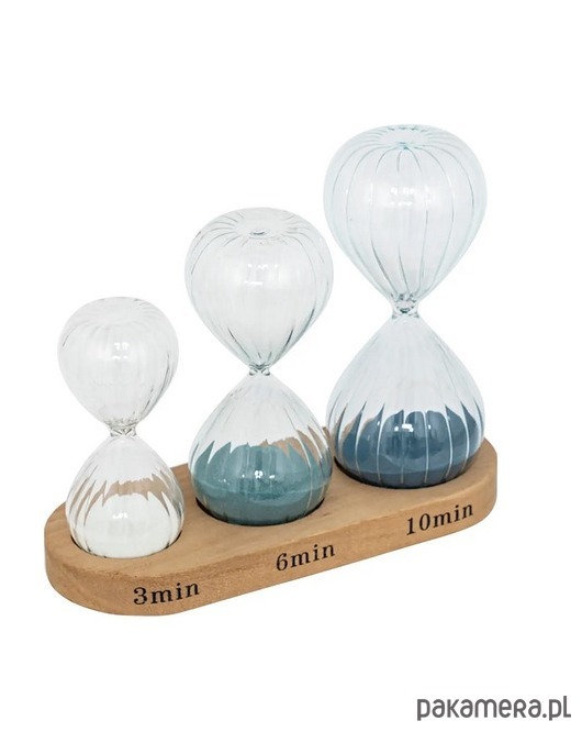 Komplet trzech klepsydr na drewnianej podstawce. Wykonane zostały z karbowanego szkła. Są w kolorze białym, turkusowym oraz niebieskim. Zapakowane w pudełko prezentowe.