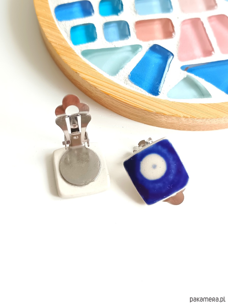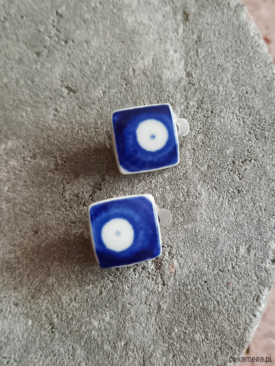 Ceramika w Bolesławcu i jego okolicach produkowana była już w XIV wieku. Do dziś najważniejszy surowiec, czyli glina wydobywany jest na miejscu, a tradycja wyrobu naczyń ceramicznych, rozwijana i kultywowana przez wieki - trwa. Bolesławiec jako marka, tworzona przez kilkadziesiąt różnych manufaktur, znana jest na całym świecie, a charakterystycznego wzoru w kobaltowe kropki nie sposób pomylić z żadnym innym. Co najbardziej wyróżnia Bolesławiec, to że szkliwo nakładane jest ręcznie, za pomocą stempelków z gąbki. Oto kwadratowe klipsy, które wykonałam z fragmentów ceramiki bolesławieckiej (dekoracja nr 42). Kawałki stłuczki oszlifowałam i połączyłam z metalowymi zapięciami w kolorze srebrnym. Ceramikę zeszlifowałam również z grubości - jest cieńsza niż pierwotnie, dzięki czemu spinki nie są masywne. Brzegi pokryłam lakierem, co sprawia, że nie brudzą się i nie chłoną wilgoci. Wymiary elementów ceramicznych: 16 x 16 mm. Unikat - każdy z moich wyrobów występuje w jednym egzemplarzu. Upcykling - nie reprodukuję wykorzystywanych wzorów, niczego nie domalowuję - wykorzystuję wyłącznie oryginalne naczynia i motywy, które się na nich znajdują. Tym samym, stłuczce z odzysku nadaję nowe życie.