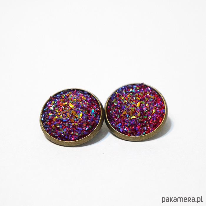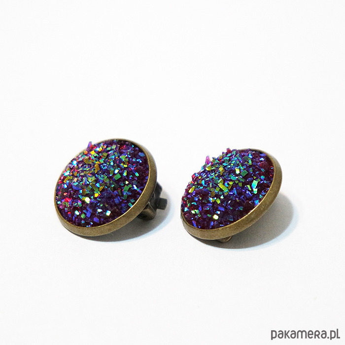 Niezwykłe klipsy z kaboszonem z żywicy - druzy, mieniący się w odcieniach burgundu, niebieskiego i złota.