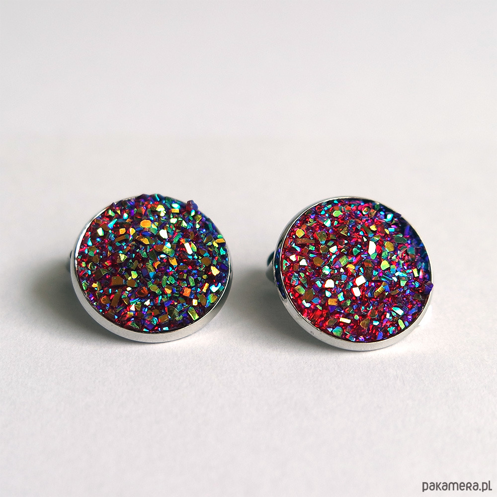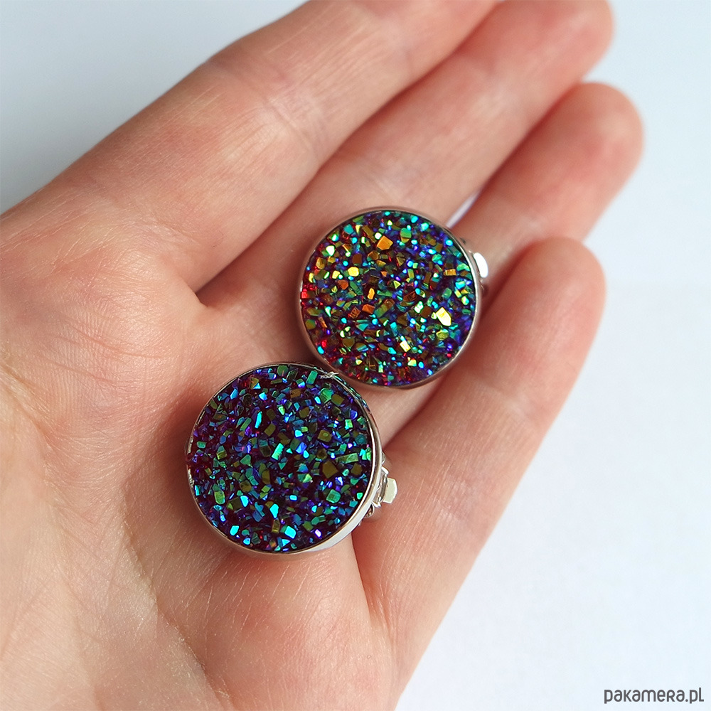 Niezwykłe klipsy z kaboszonem z żywicy - mieniący się w odcieniach burgundu, niebieskiego, turkusu i złota.