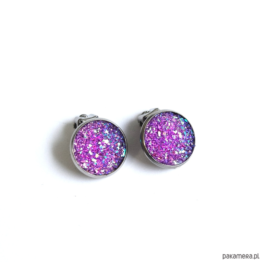 Oryginalne klipsy z kaboszonem z żywicy - druzy, mieniący się w odcieniach fioletu, niebieskiego, turkusu i złota.