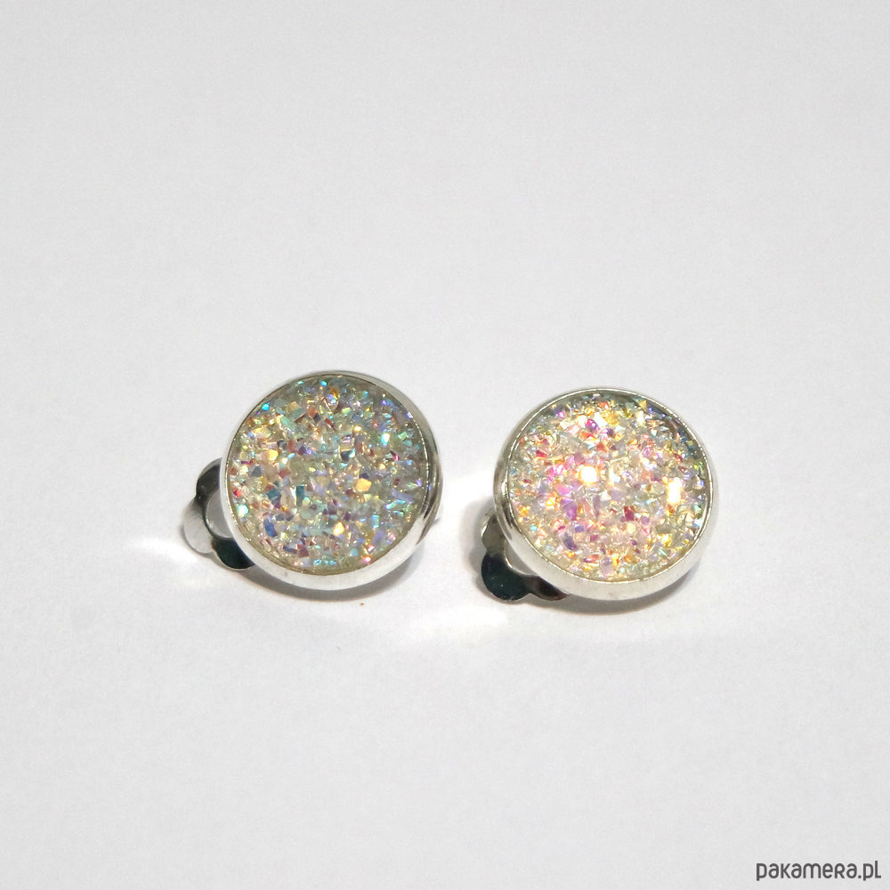 Niezwykłe, subtelne klipsy z kaboszonem z żywicy - druzy, mieniący się w odcieniach pastelowych.