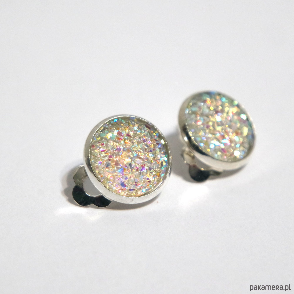 Niezwykłe, subtelne klipsy z kaboszonem z żywicy - druzy, mieniący się w odcieniach pastelowych.