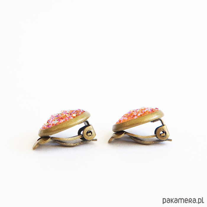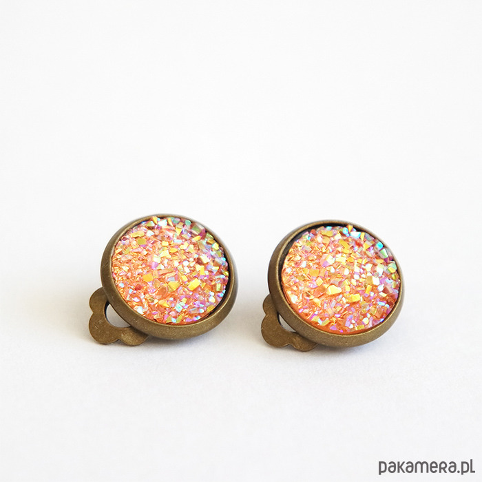 Niezwykłe, subtelne, małe klipsy z kaboszonem z żywicy - druzy, mieniący się w odcieniach łososiowym, różowym i złotym.