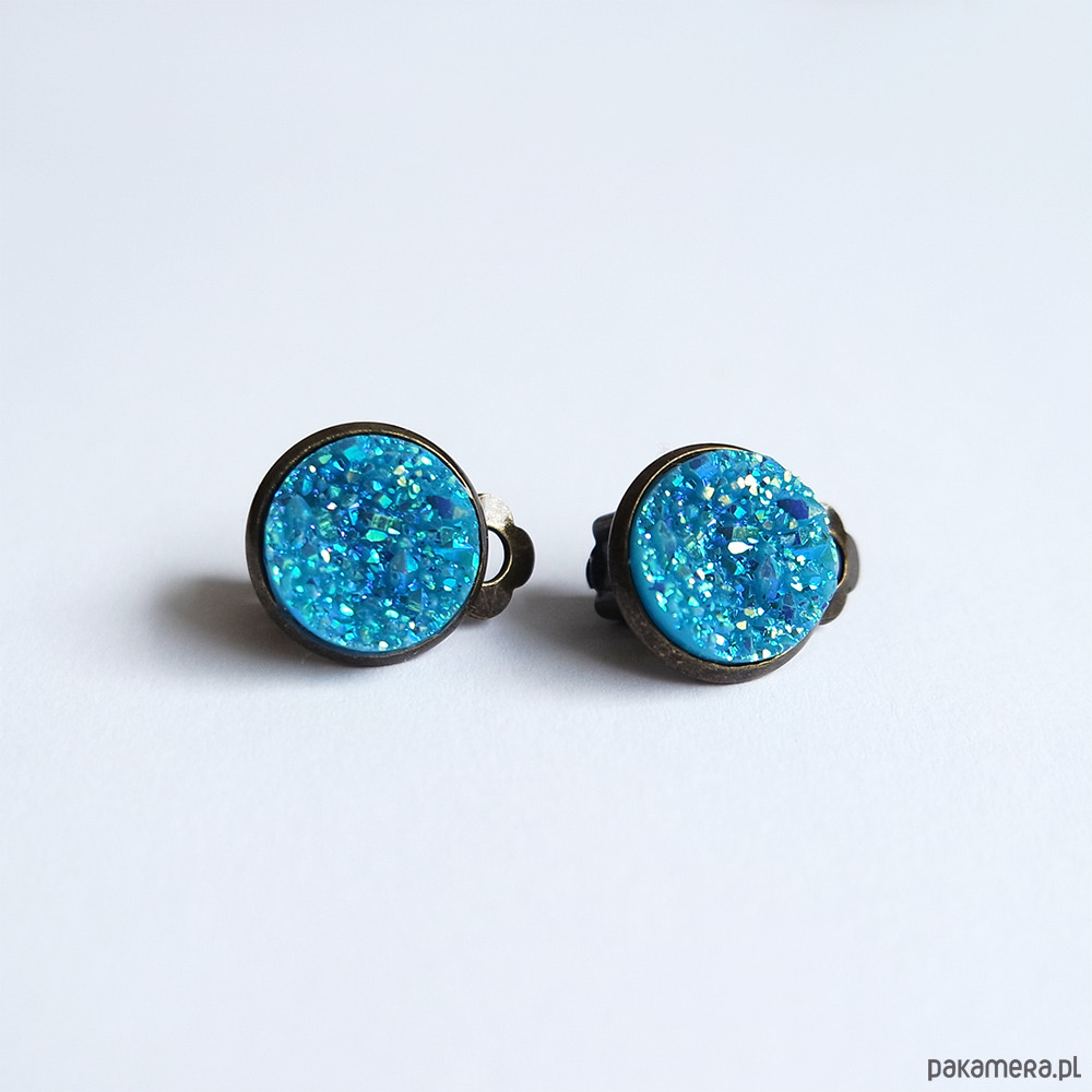 Niezwykłe, subtelne, małe klipsy z kaboszonem z żywicy druzy mieniący się w odcieniach niebieskiego, turkusu i złota.