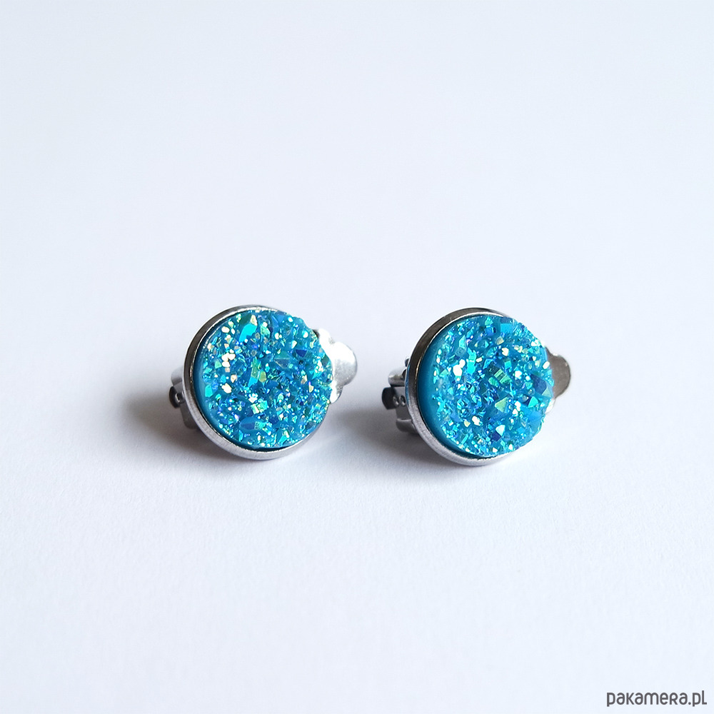 Niezwykłe, subtelne, małe klipsy z kaboszonem z żywicy druzy mieniący się w odcieniach niebieskiego, turkusu i złota.