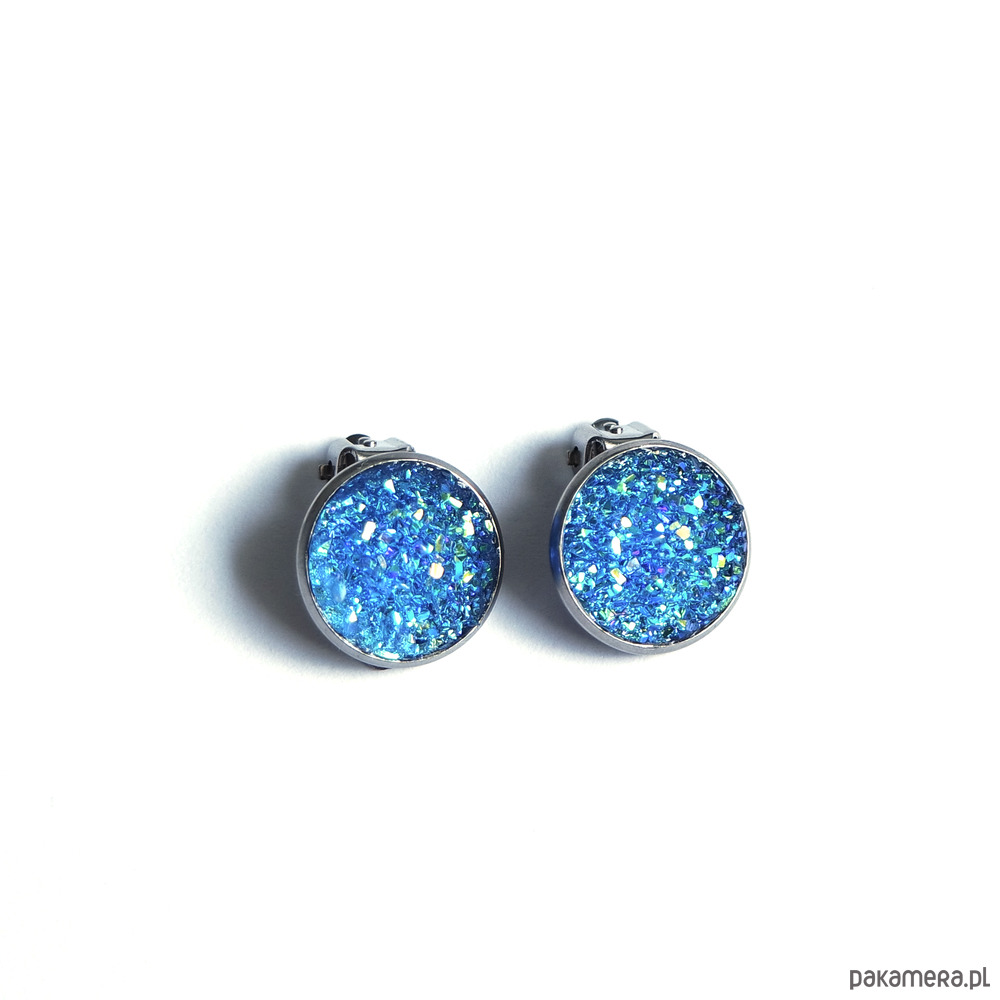 Oryginalne klipsy z kaboszonem z żywicy - druzy, mieniący się w odcieniach niebieskiego, turkusu i złota.