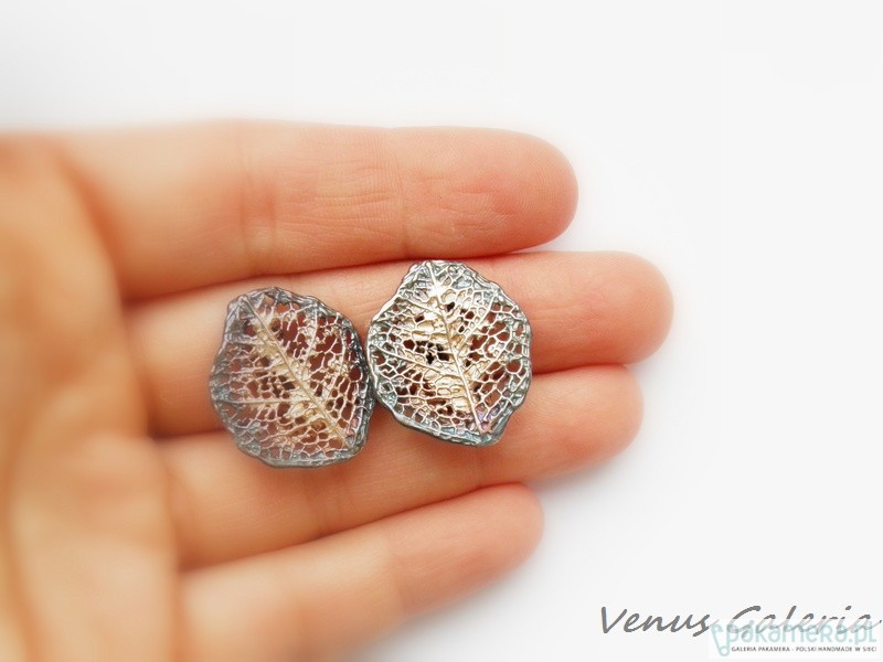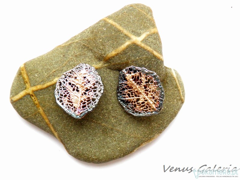 Klipsy wykonane ze srebra w kształcie listków. Wykończone oksydą brązową. Szerokość listków 2 cm na 2,5 cm. Waga: 5,7 gr. Delikatne, stylowe i oryginalne.