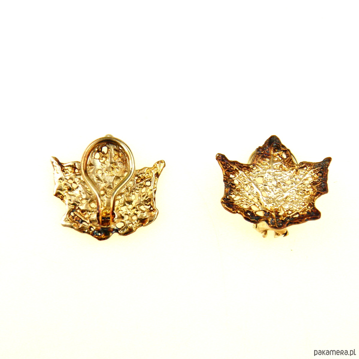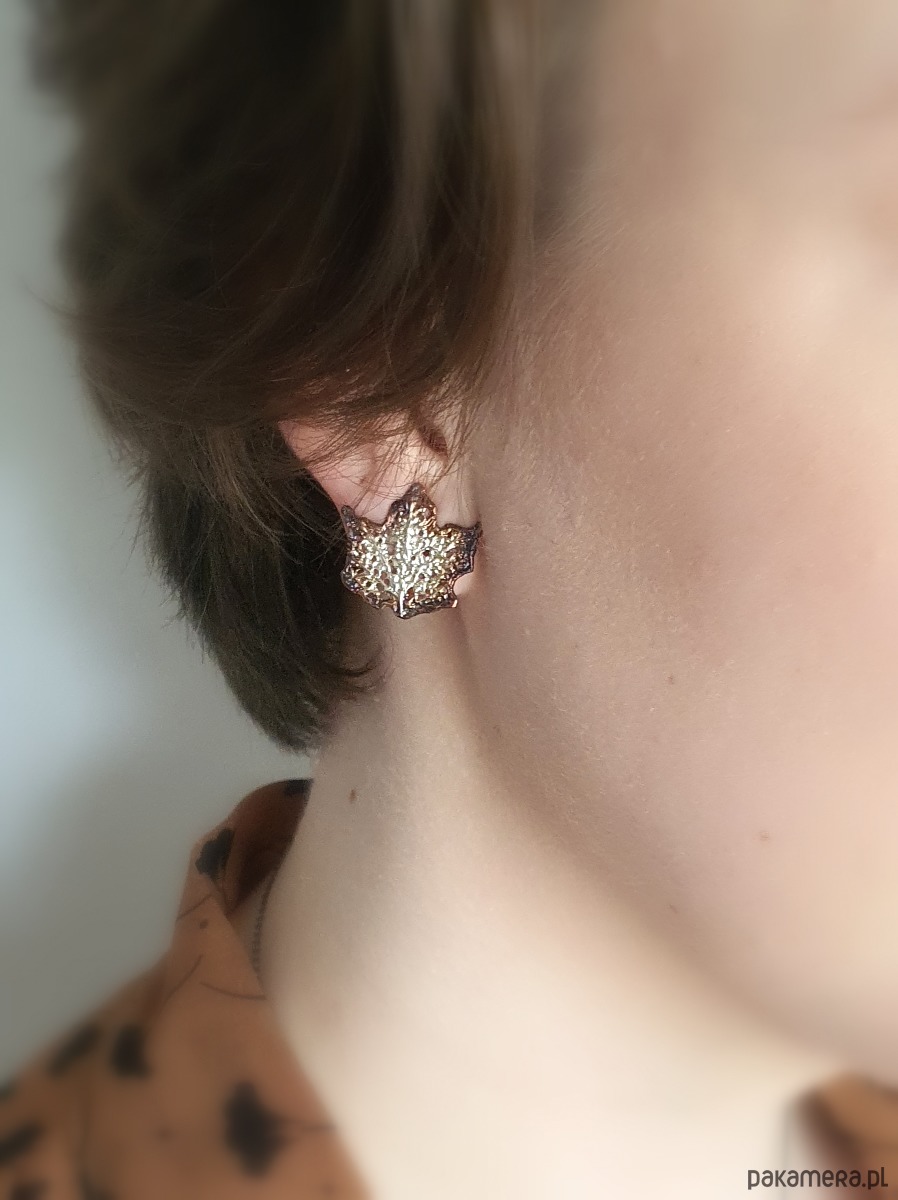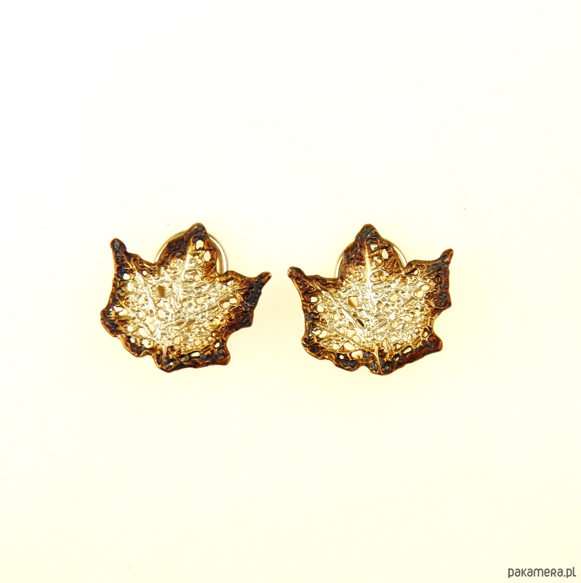 Malutkie, delikatne klipsy srebrne w kształcie listków klonu. Długość listków 2,5 cm, szerokość 2,5 cm. Próba srebra 925. Wykończone oksydą. W pięknych brązowo-beżowych kolorach. Idealna alternatywa dla kobiet, które nie noszą kolczyków.