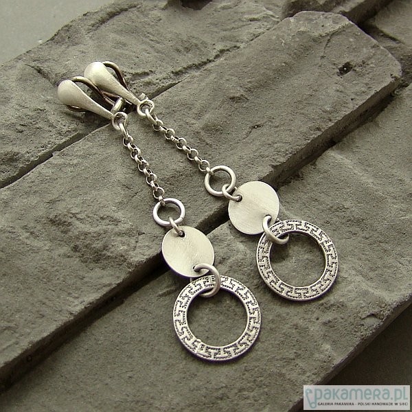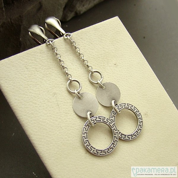 Modne, nowoczesne i kobiece klipsy wykonane w całości z oksydowanego srebra próby 925. Wielkość kół to 1,5 cm, 1 cm i 0,6 cm. Zapięcia również srebrne, wygodne. Długość klipsów bez zapięć to ok. 5,2 cm. Ozdobnie zapakowane.