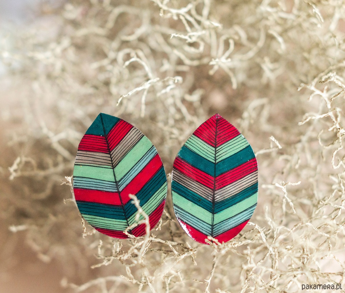 Piękne duże klipsy listki nawiązujące kolorystyką do kolorów lasu: zieleni paproci i bordowo - czerwonej żurawiny.