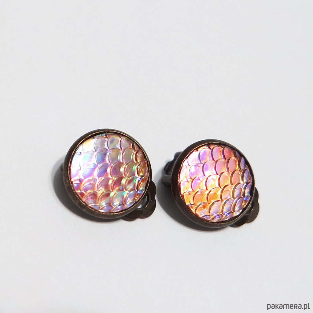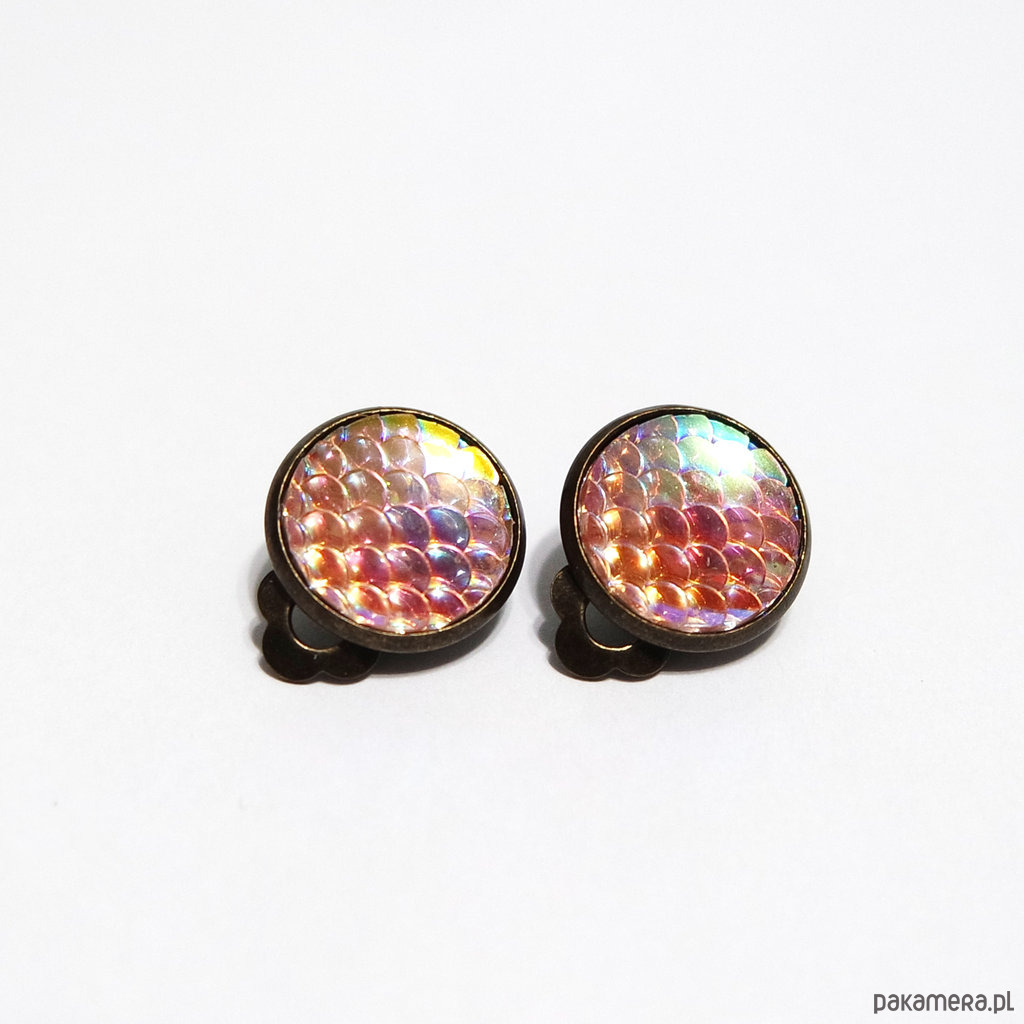 Niezwykłe, subtelne, małe klipsy z kaboszonem z żywicy imitującym łuski.