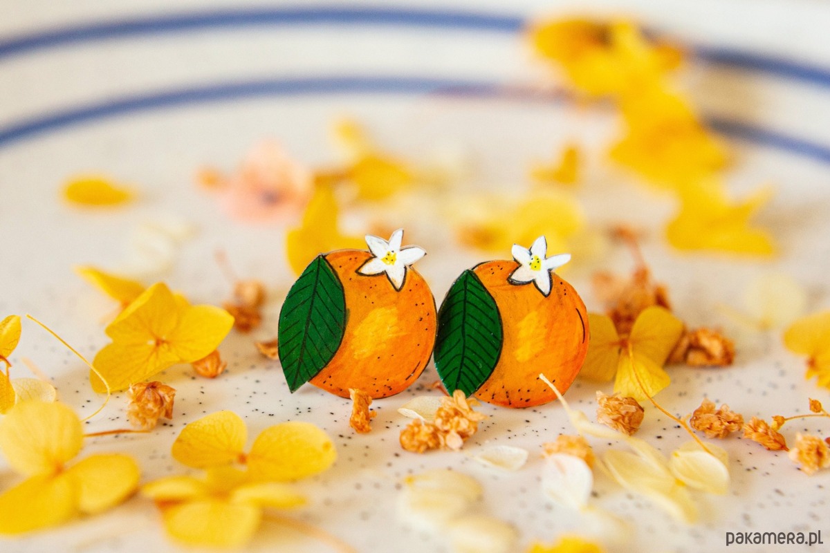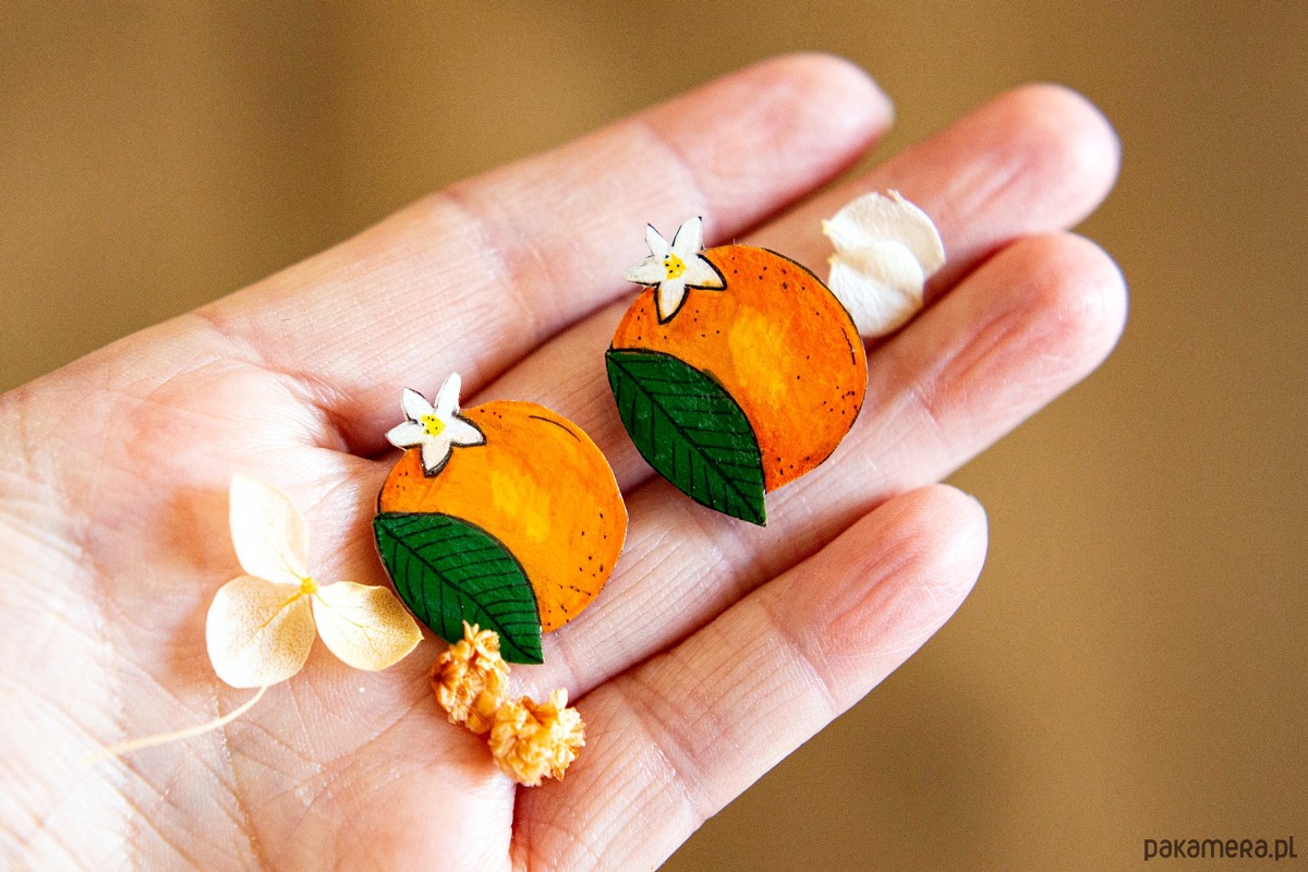Ręcznie wykonane klipsy w kształcie soczystych pomarańczy to wyjątkowy dodatek dla miłośniczek oryginalnej biżuterii. Każdy element został starannie wycięty, pomalowany i zabezpieczony, dzięki czemu kolory są intensywne, a detale – takie jak zielone listki i delikatne białe kwiaty – nadają całości świeżości i lekkości.
