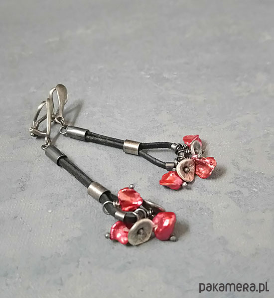 Klipsy wykonane z oksydowanego srebra próby 925, naturalnego rzemienia w kolorze czarnym oraz różowych pereł.