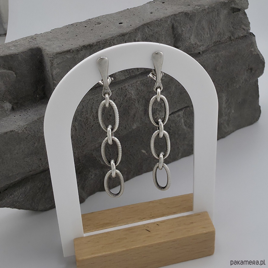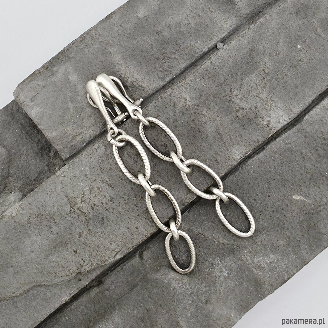 Minimalistyczne, dosyc masywne klipsy na co dzień i nie tylko. Wykonane w całości z oksydowanego srebra próby 925 - zapięć i masywnego, fakturowanego łańcucha, którego większe ogniwa maja wielkość 14,5x8 mm. Całkowita długość klipsów to 6,5 cm. W mojej galerii jest dostępna bransoletka i naszyjnik do kompletu. Mogę wykonać również bizuterie bez oksydacji. Ozdobnie zapakowane.