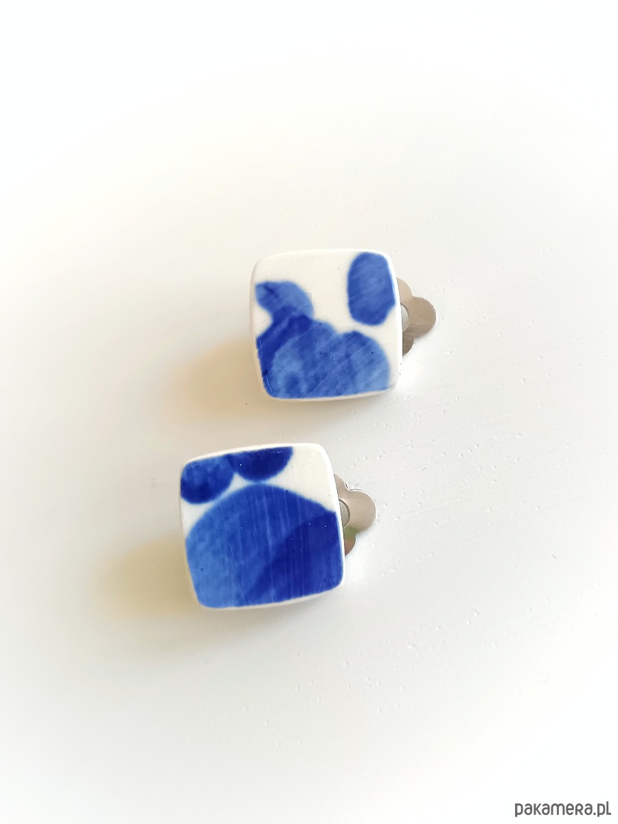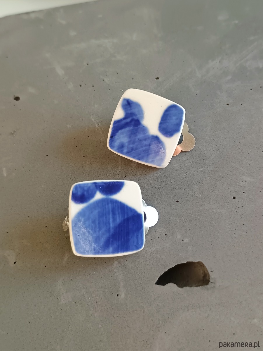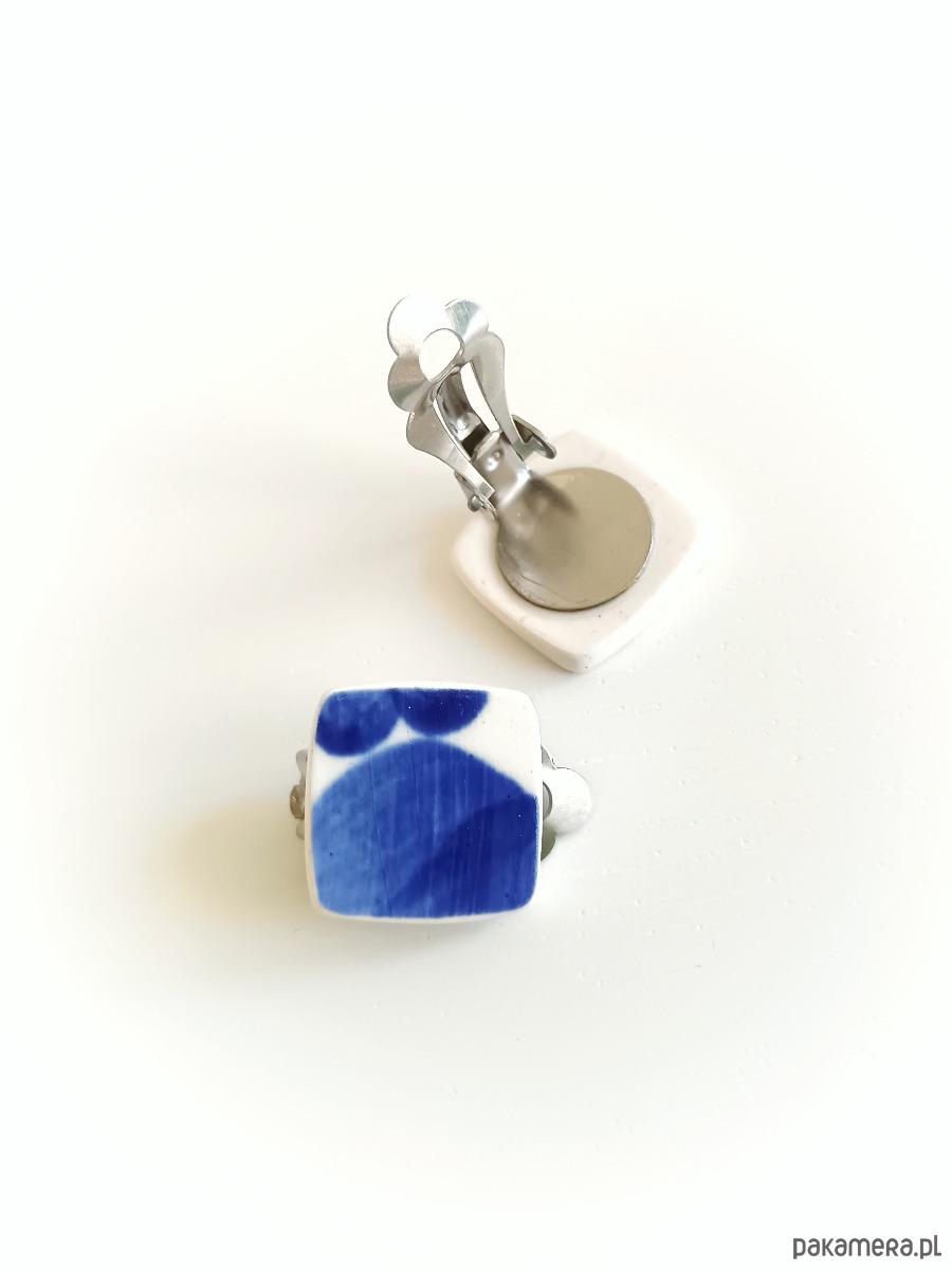 Historia fajansu włocławskiego sięga 1873 roku. Zakładów było kilka, zmieniali się właściciele i lokalizacje. Produkcja najbardziej rozwinęła się po II WŚ, kiedy w miejscowych zakładach powstawał nie tylko fajans, ale również porcelit i porcelana. Zróżnicowane było także wzornictwo - produkowano nie tylko naczynia, ale również elementy wyposażenia wnętrz (lampy, świeczniki, żyrandole). Mimo tej różnorodności, najbardziej rozpoznawalnym wyrobem z Włocławka jest talerz w ręcznie malowane kobaltowe kwiaty (z takich najchętniej korzystam :). I mimo, że najdłużej działająca fabryka zakończyła działalność w 1991 roku, dzięki lokalnym inicjatywom produkcja fajansu została wznowiona i trwa do dziś! Oto klipsy, które wykonałam z fragmentów fajansu włocławskiego ręcznie malowanego w kobaltowe wzory. Kawałki stłuczki oszlifowałam w kwadratowe kształty i połączyłam z metalowymi zapięciami w kolorze srebrnym. Ceramikę zeszlifowałam również z grubości - jest cieńsza niż pierwotnie, dzięki czemu spinki nie są masywne. Brzegi pokryłam lakierem, co sprawia, że nie brudzą się i nie chłoną wilgoci. Wymiary elementów ceramicznych: 17 x 17 mm. Unikat - każdy z moich wyrobów występuje w jednym egzemplarzu. Upcykling - nie reprodukuję wykorzystywanych wzorów, niczego nie domalowuję - wykorzystuję wyłącznie oryginalne naczynia i motywy, które się na nich znajdują. Tym samym, stłuczce z odzysku nadaję nowe życie.
