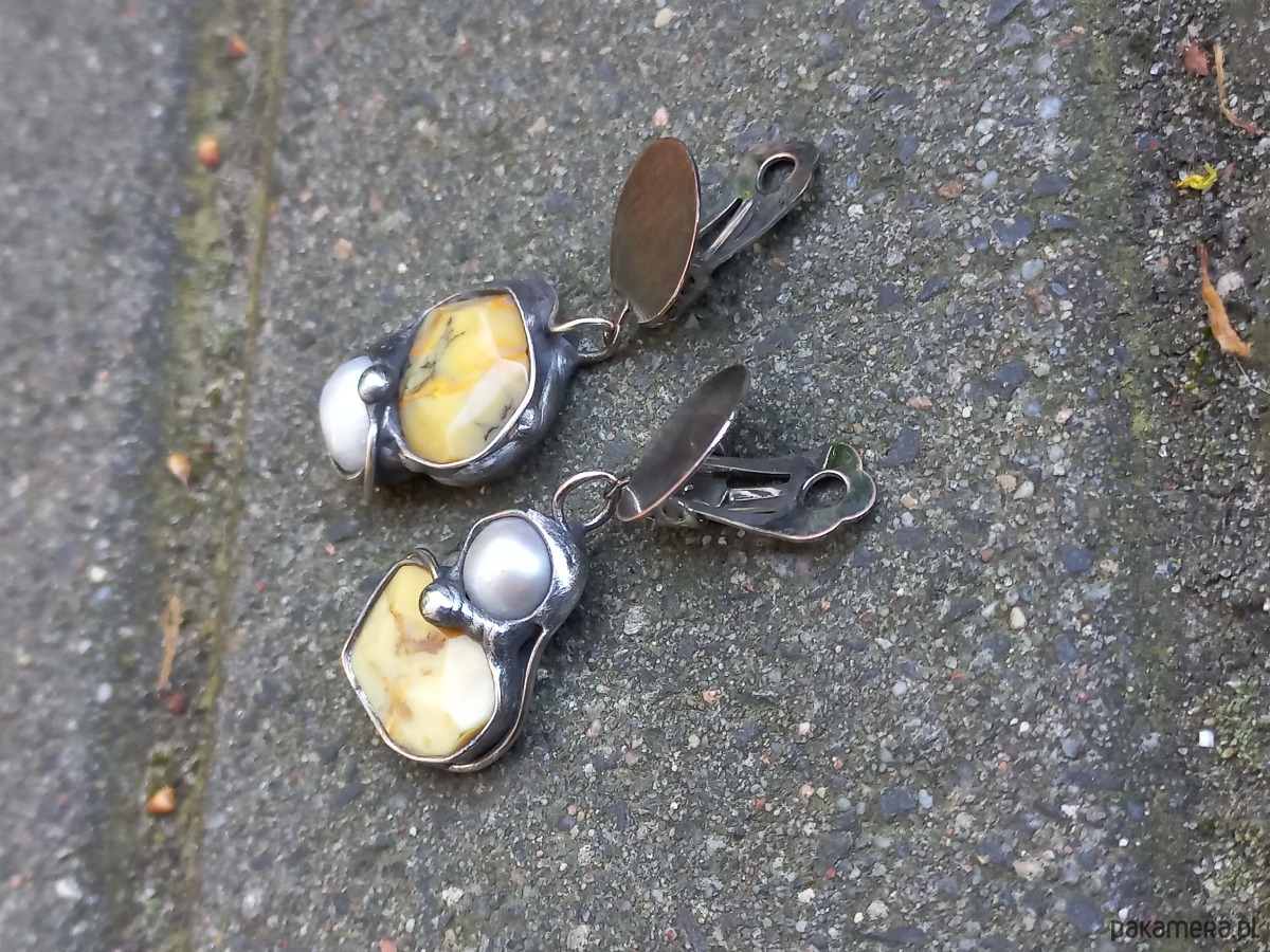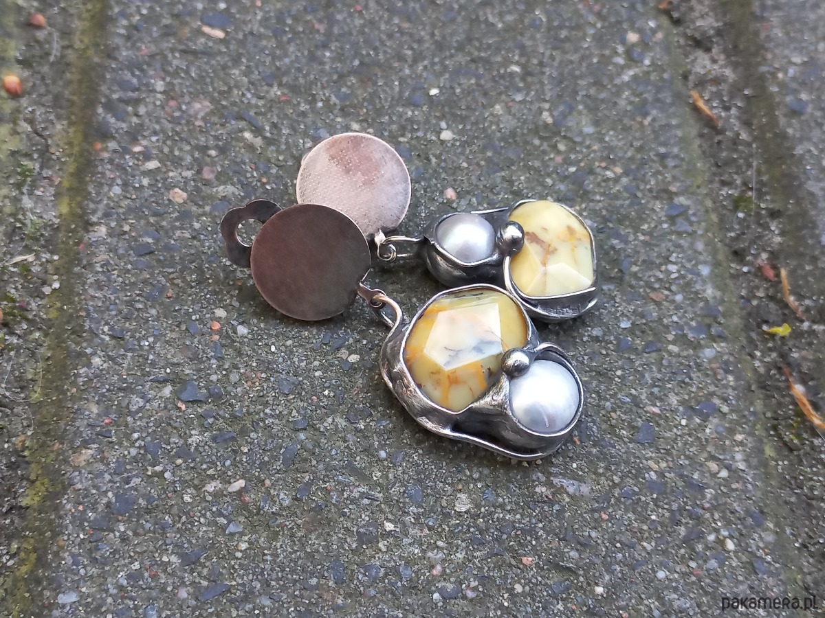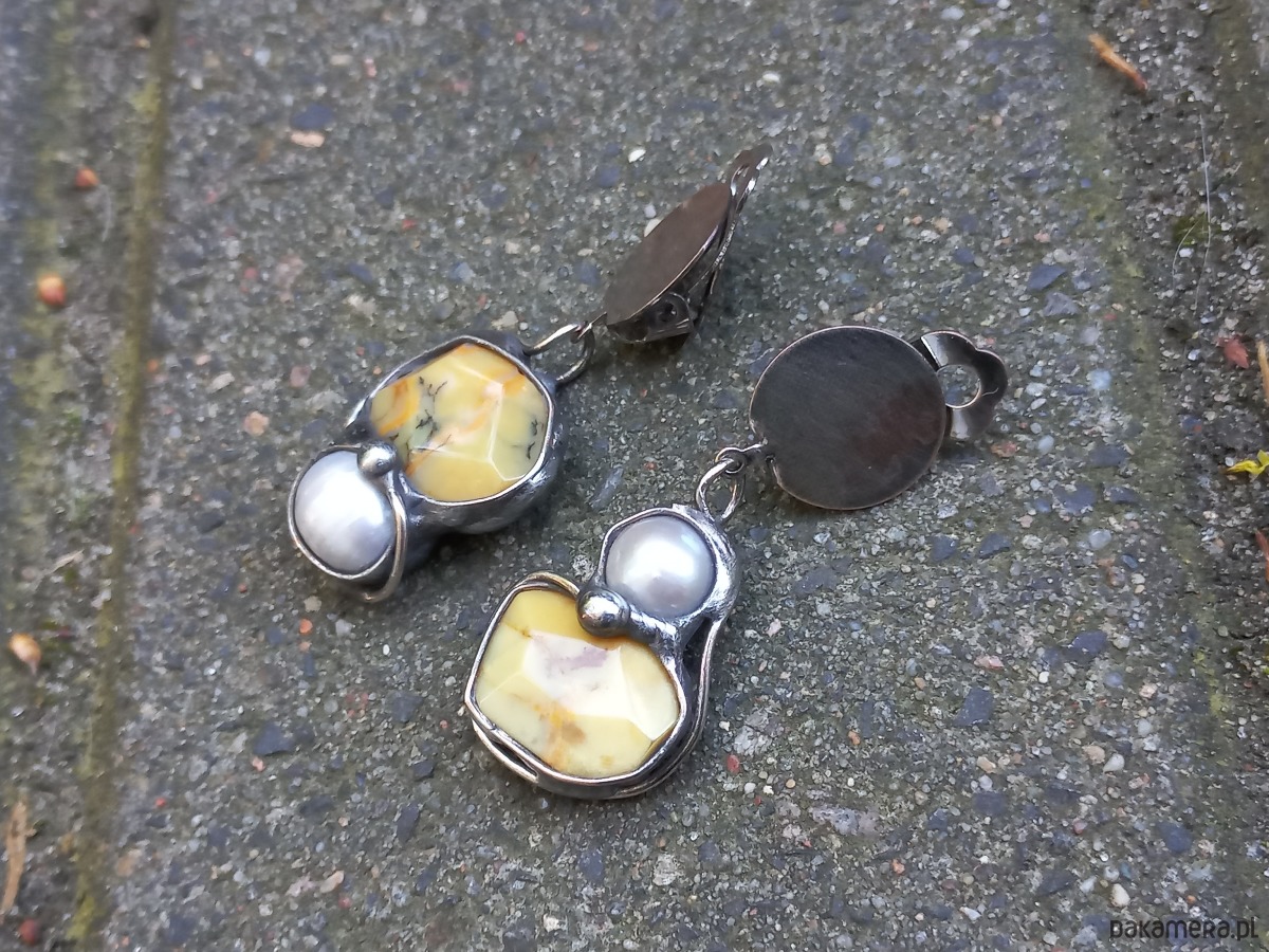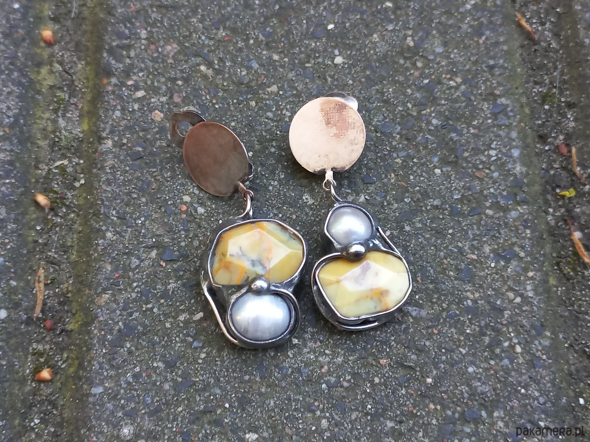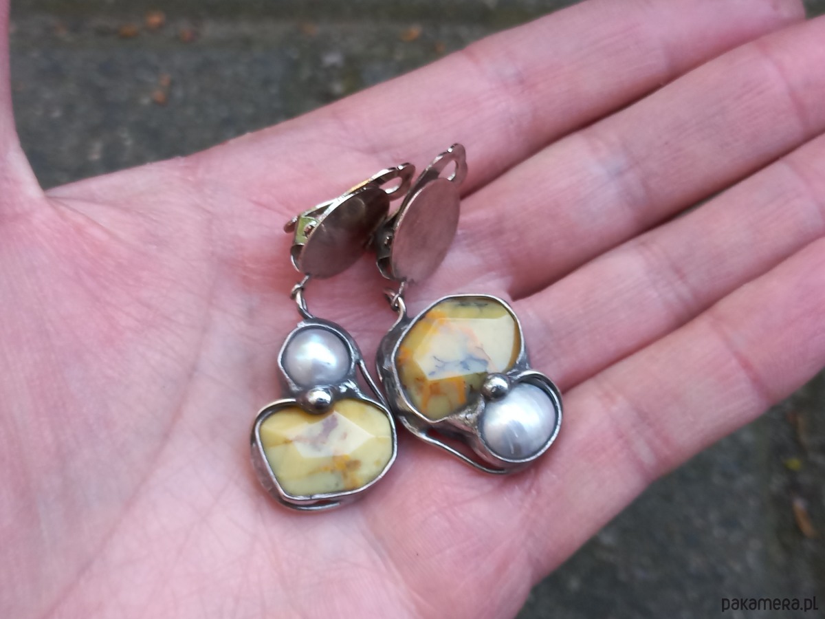 Klipsy wykonane z miedzi, cyny, pereł i jaspisów. Długość z zapięciem ok. 5 cm, szerokość ok. 2 cm. Zapięcia metalowe. Klipsy nie są idealnie równe.