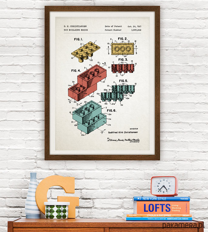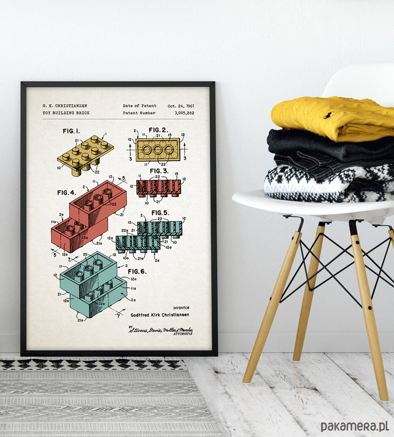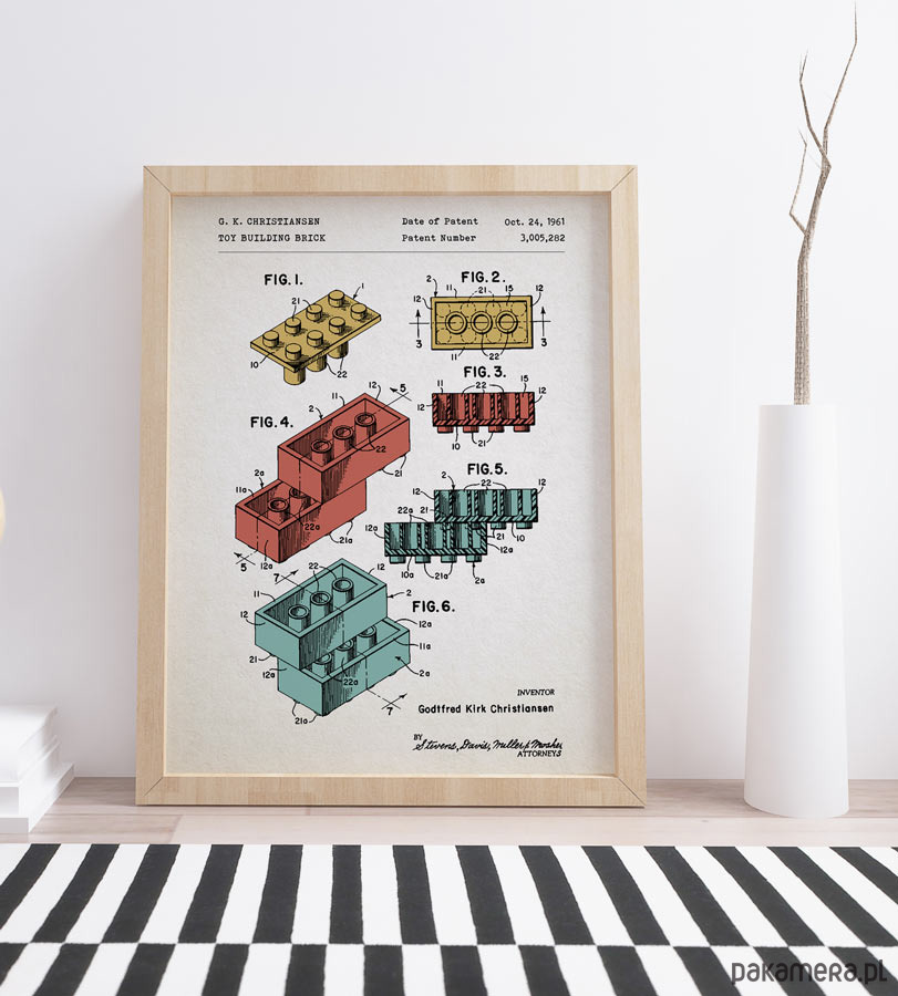 Plakat z reprodukcją patentu na klocki zaprojektowane przez G. Christiansena. Patent o numerze 3,005,282 został udzielony w 1961 roku przez Urząd Patentów i Znaków Towarowych Stanów Zjednoczonych.
