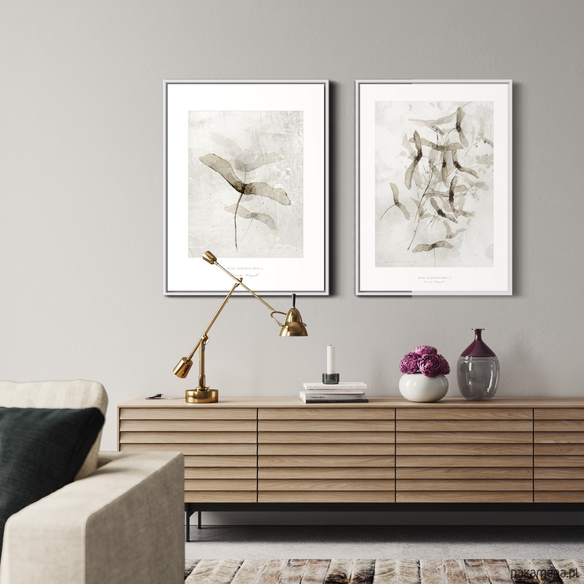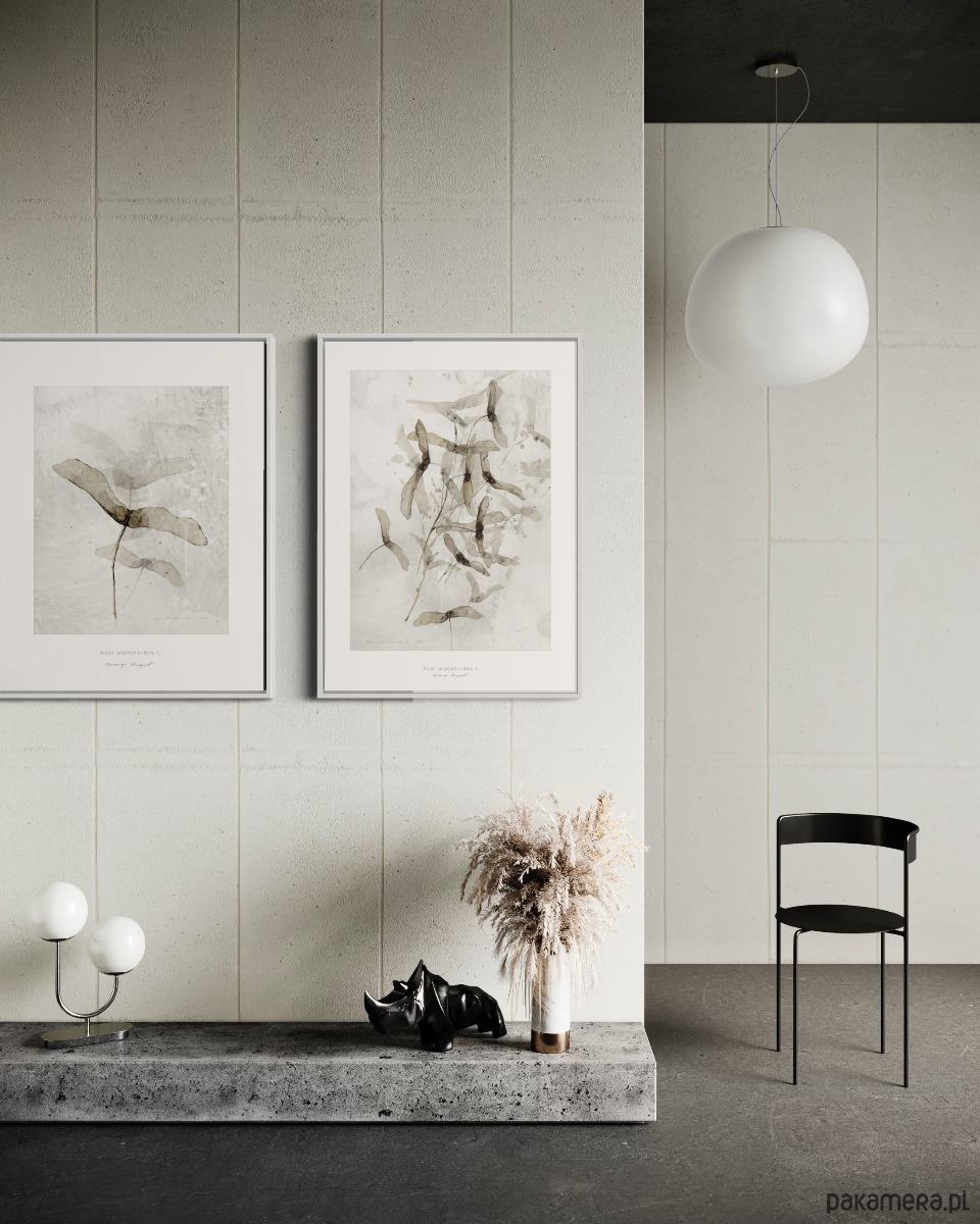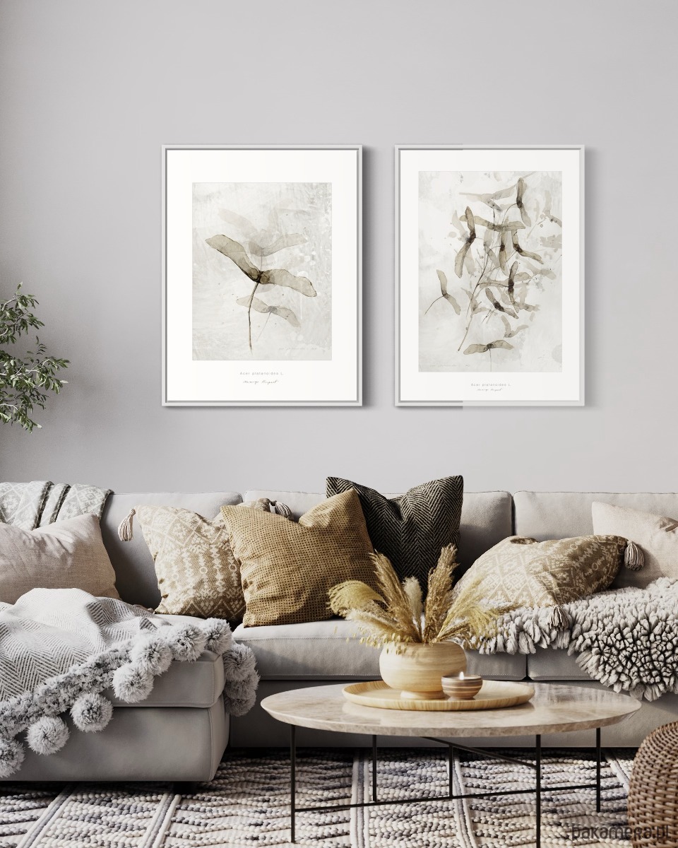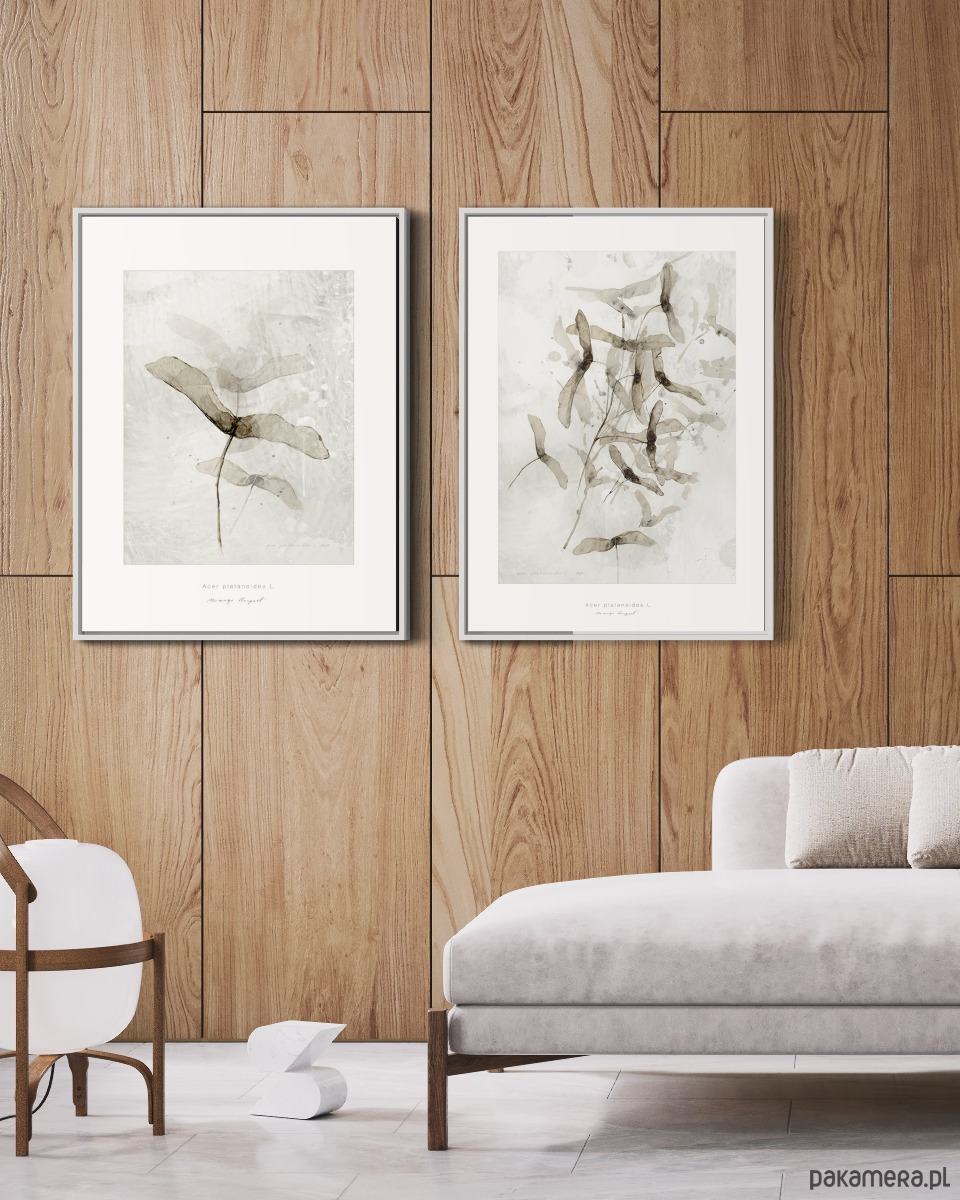 Spójny duet grafik z motywem klonu, idealny do nowoczesnych i skandynawskich wnętrz.