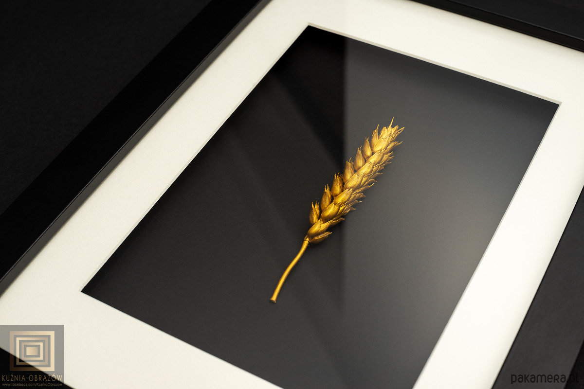 Prawdziwy kłos pszenicy został najpierw ususzony, po czym pomalowany ręcznie złotym tuszem artystycznym o wysokiej światłotrwałości, a na koniec zabezpieczony klejem winylowym, który zapewnia wytrzymałą, elastyczną powłokę odporną na kruszenie.