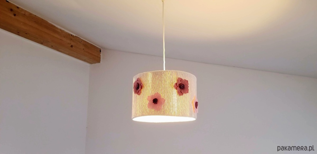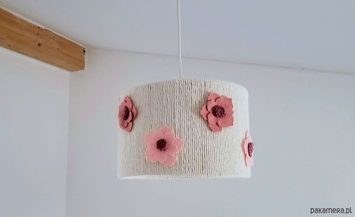 Nadaj unikalnego charakteru ozdobnym kloszem w stylu makramy połaczonej z filcowymi jasno i brudno- różowymi kwiatami.