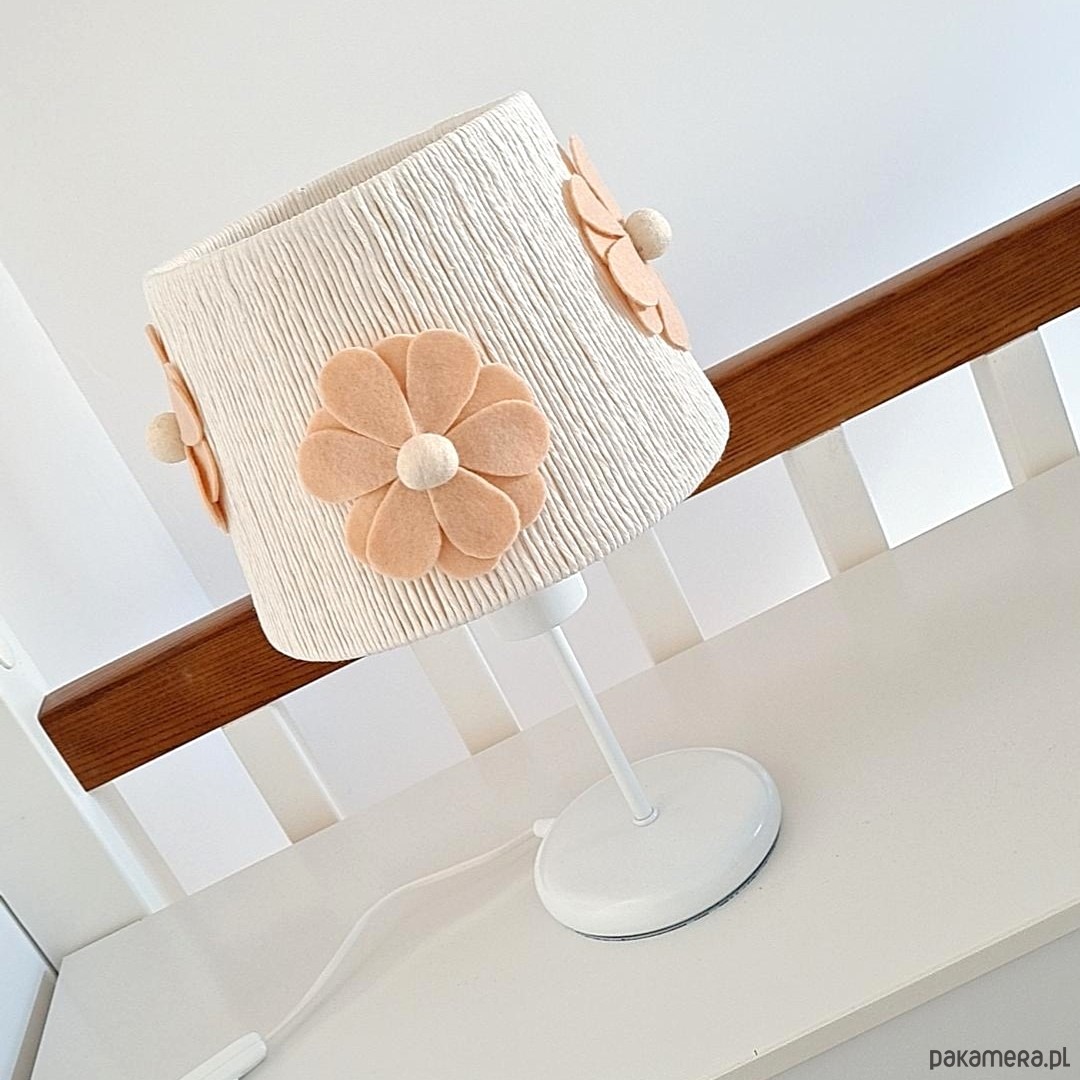 Klosz do Lampki nocnej pasujący do salonu, sypialni czy pokoju dziewczynki. Klosz został ozdobiony filclowymi kwiatkami w stylu margaretek w odcieniu "nude" z dodatkiem filcowych kulek w kolorze kremowym.Klosz ten wieczorem posłuży jako delikatne zródło światła a w dzień bedzie orgianalną i delikatną ozdobą pokoju dziewczynki