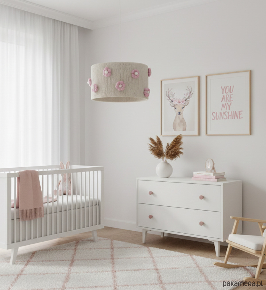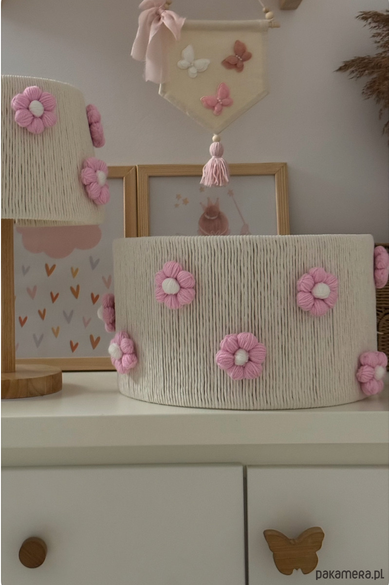 Abażur wykonany ze 100% sznurka bawełnianego o średnicy 5 mm, kwiatki w kolorze pudrowego różu wykonane na szydełku.